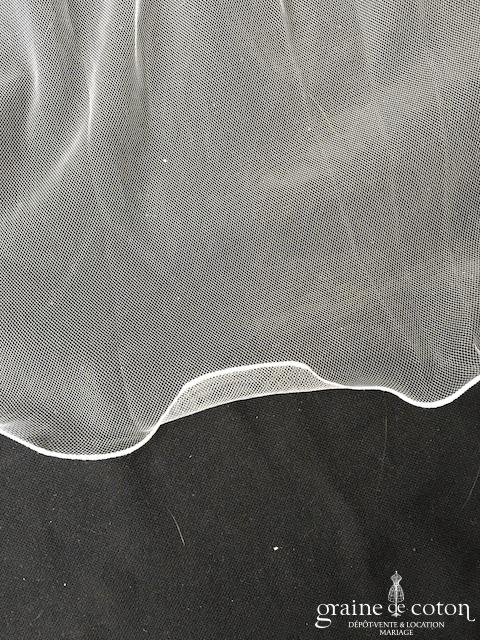 Voile court en tulle blanc bordé d’un biais de satin. Monté sur peigne, avec rabat avant.