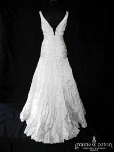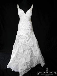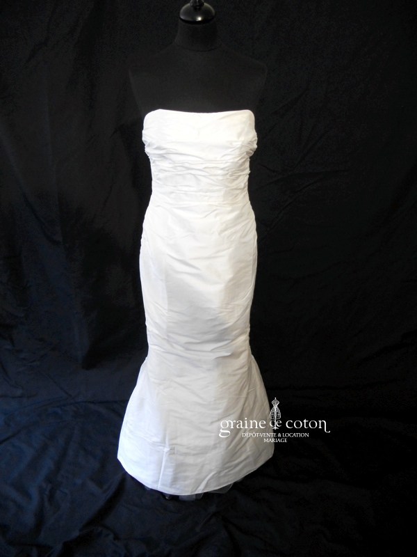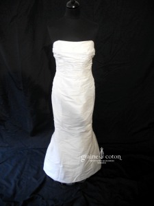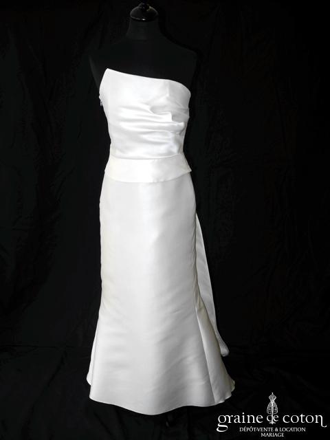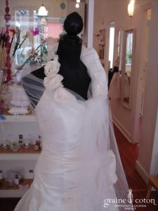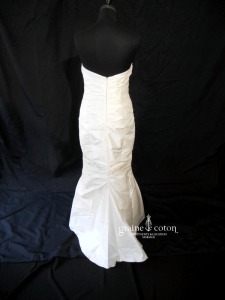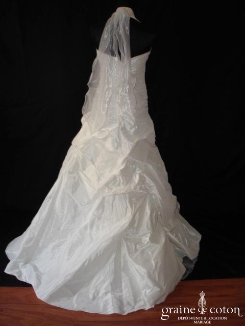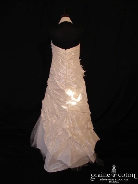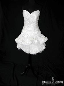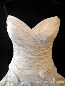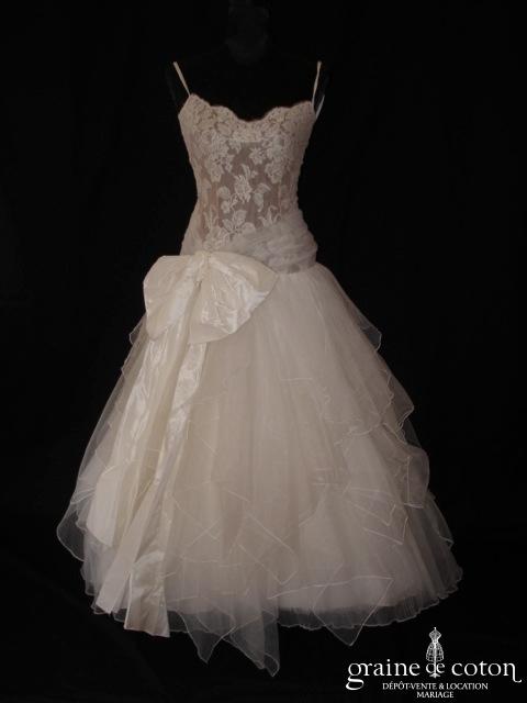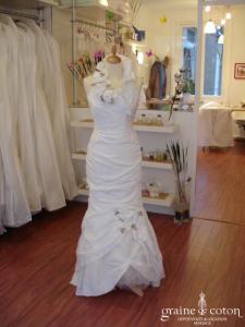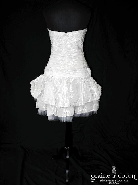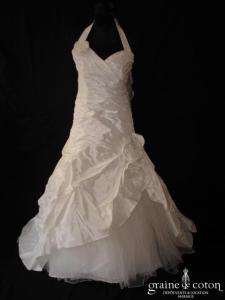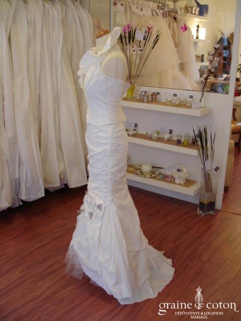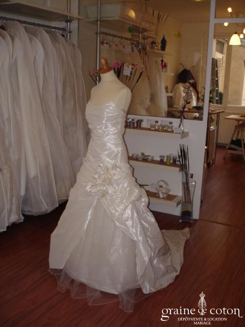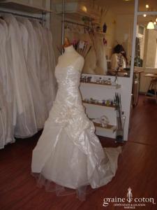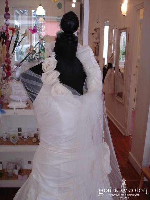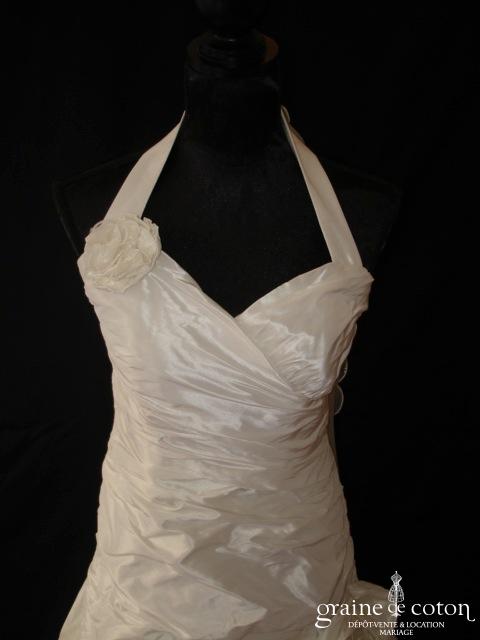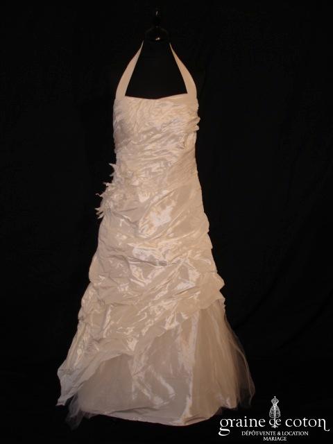 Robe une pièce en taffetas ivoire clair : bustier drapé avec tour de cou, décoré d’une fleur en mousseline et dentelle. Jupe trapèze ouverte sur un pan de tulle, petite …