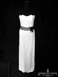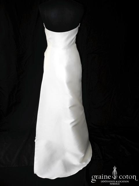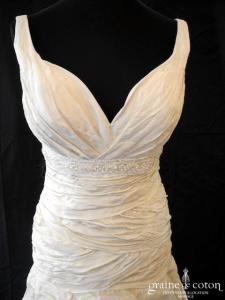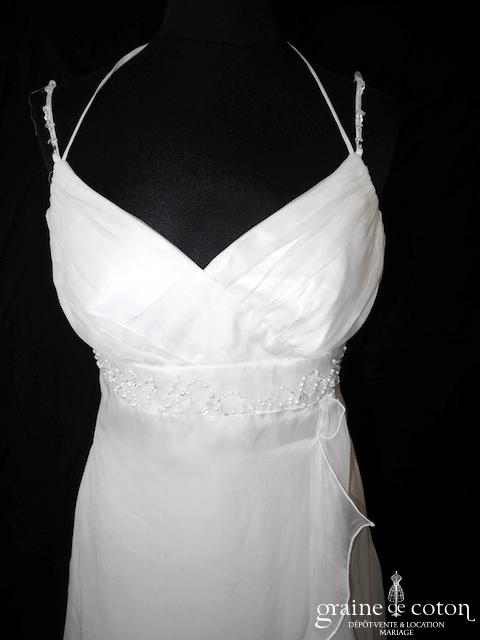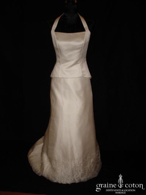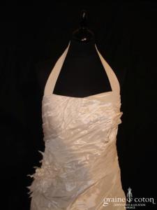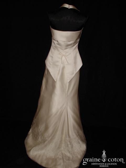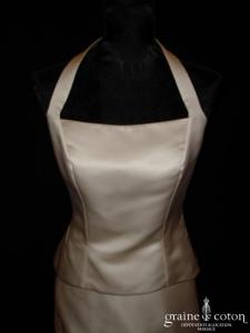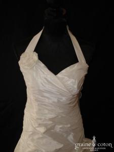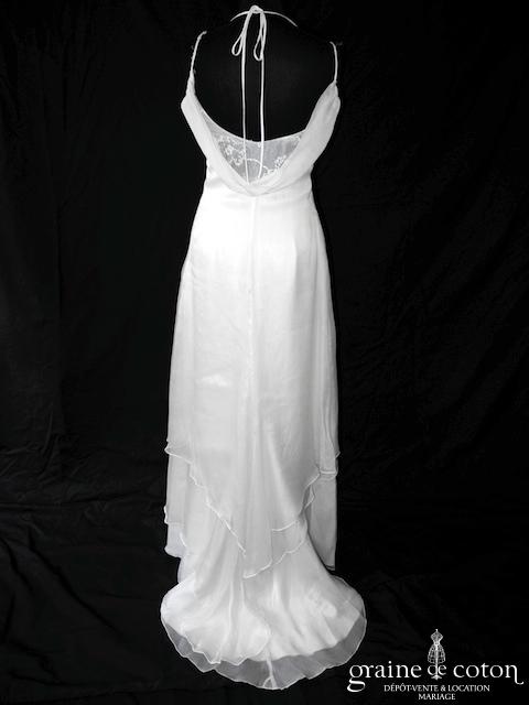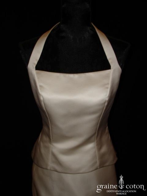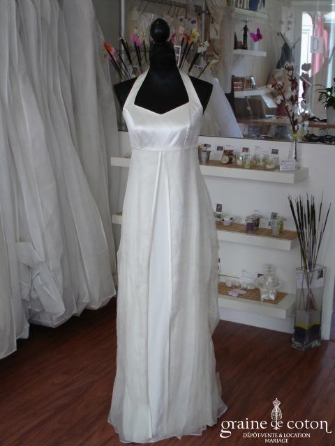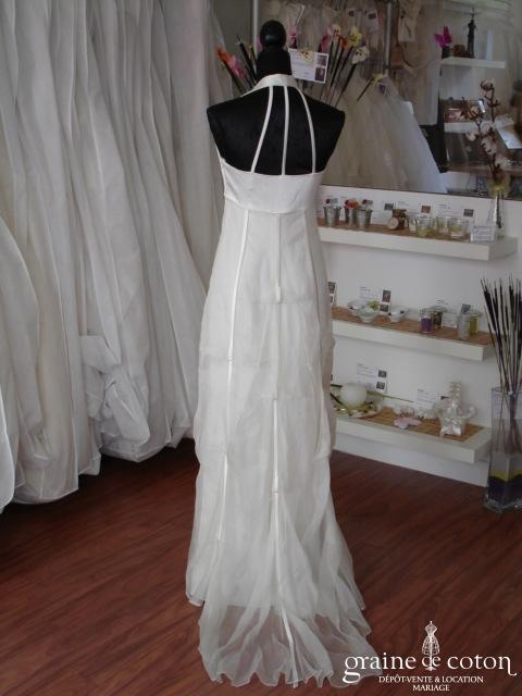 Robe une pièce en mousseline ivoire clair : bustier droit drapé avec bretelle tour de cou amovible, dos boutonné.