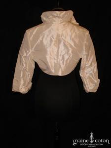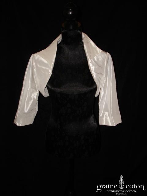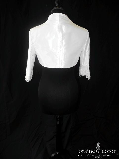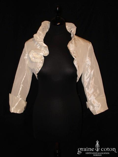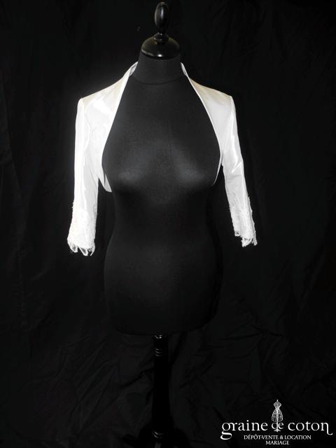 Boléro en taffetas ivoire et dentelle, manches 3/4 bordées de dentelle.
