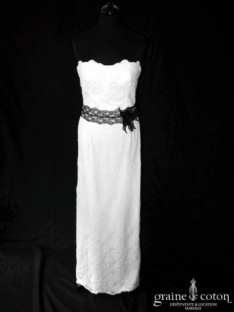 Robe une pièce ivoire clair : top en dentelle décolleté coeur et dos nu, fines bretelles. Jupe taille haute en mousseline fluide avec petite traîne. Manchettes amovibles élastiquées,en dentelle. Bohème, …