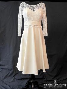 Dépôt de deux nouveaux modèles : – une création Vanilla Sposa en dentelle et tulle nude fluide pailleté : beaux décolletés en V devant et dos, une vraie princesse bohème …
