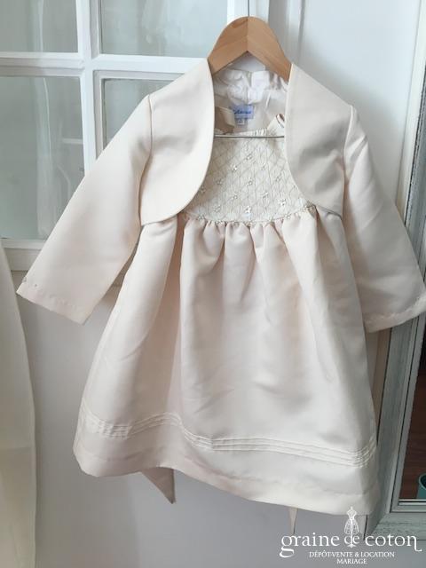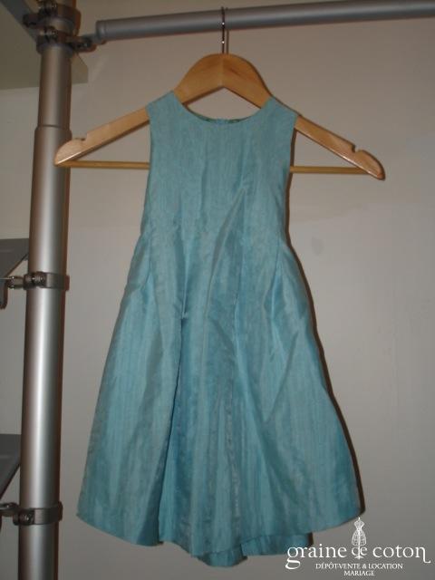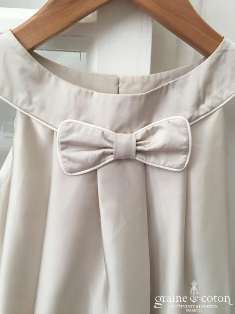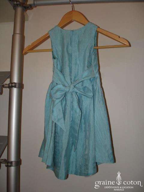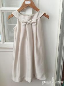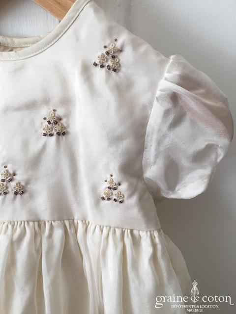 Robe demoiselle d’honneur avec bustier roses en organza et jupe en tulle plumetis blanc. Ceinture noire à la taille, à nouer dans le dos.