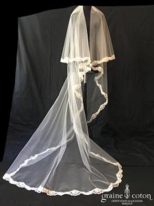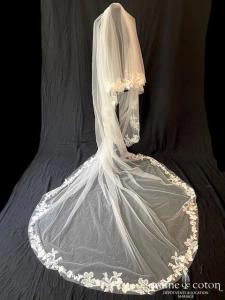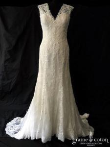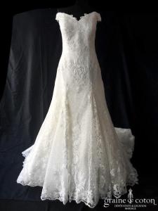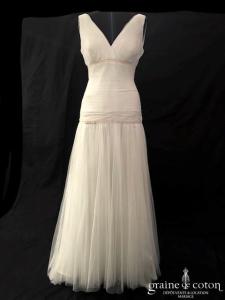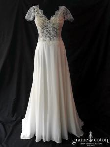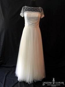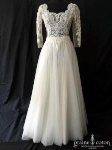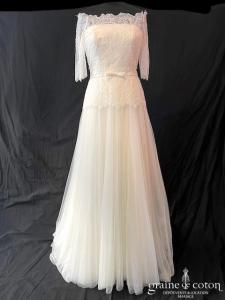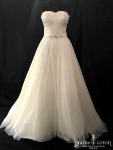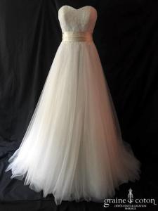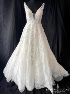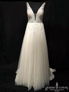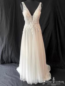 Dépôt du modèle « Tera » de Rosa Clara, tout en tulle et guipure ivoire clair, délicatement perlée. Beau décolleté en V et jupe en tulle pour un beau volume tout en …
