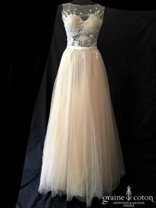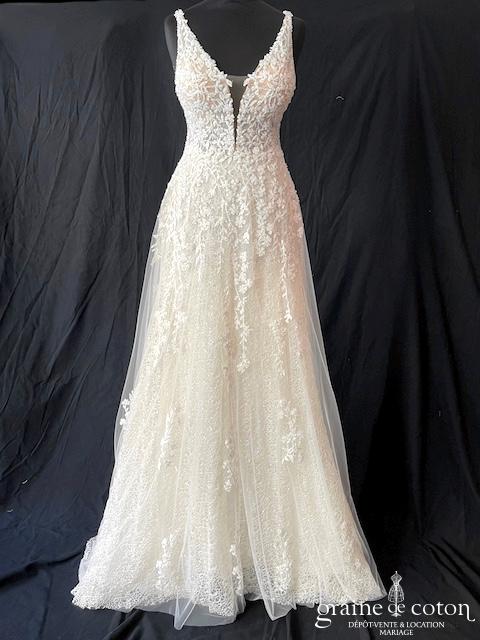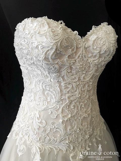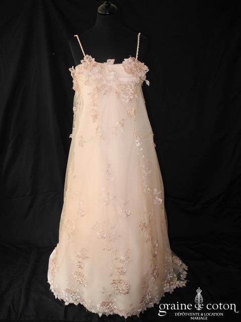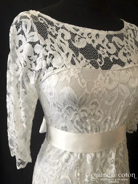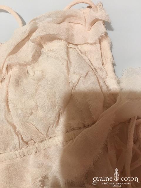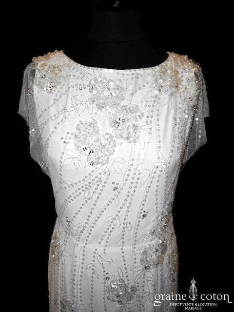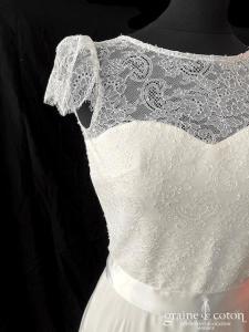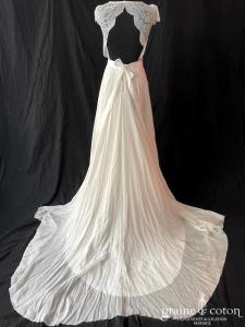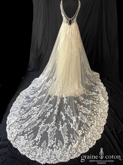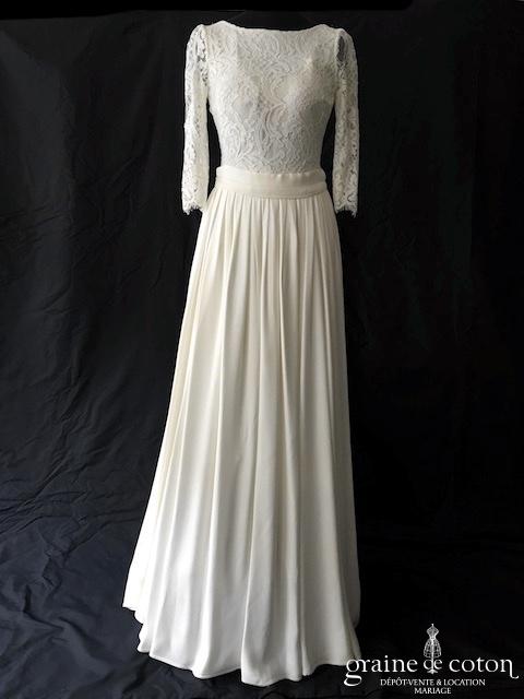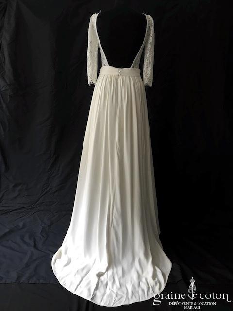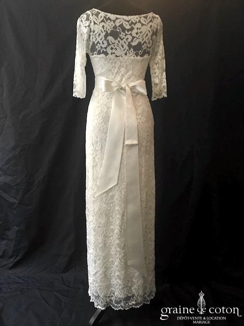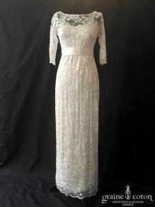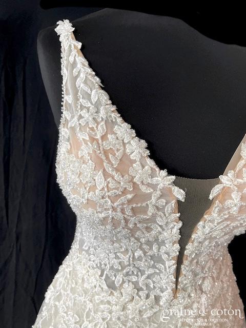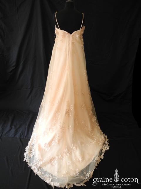 Robe une pièce tout en dentelle et perles ivoire clair : top à fines bretelles décolleté V profond et dos nu. Jupe fourreau légèrement évasée taille haute avec longue traîne …