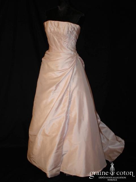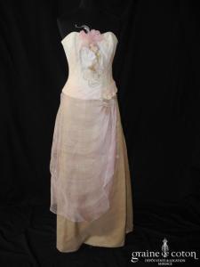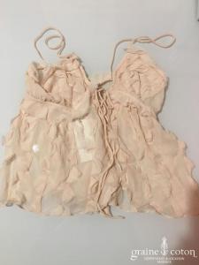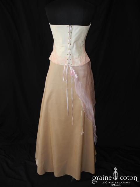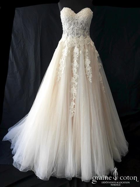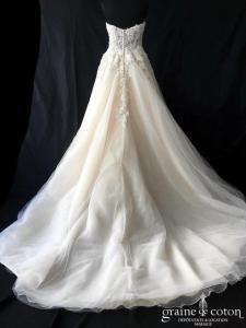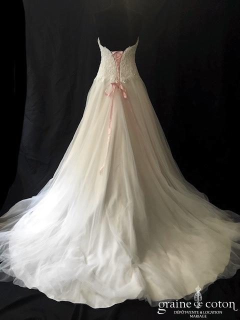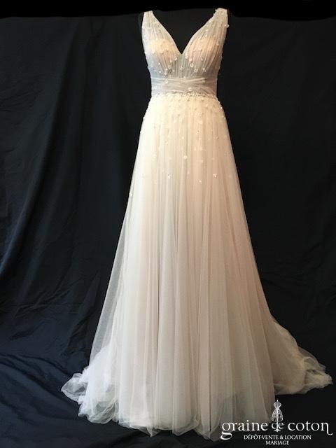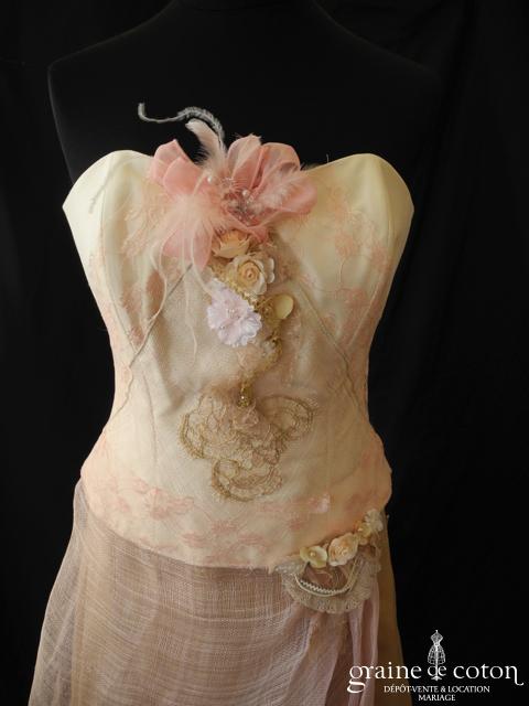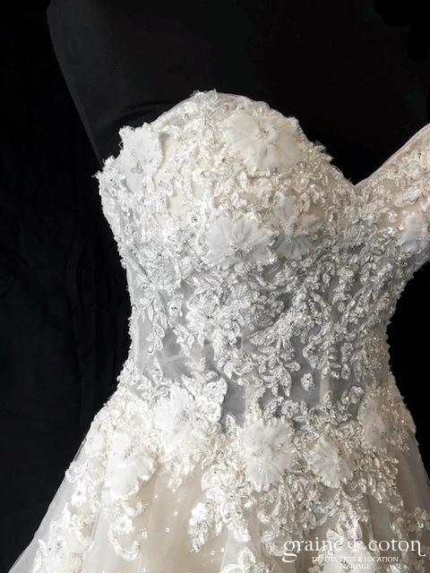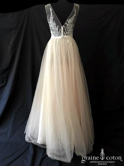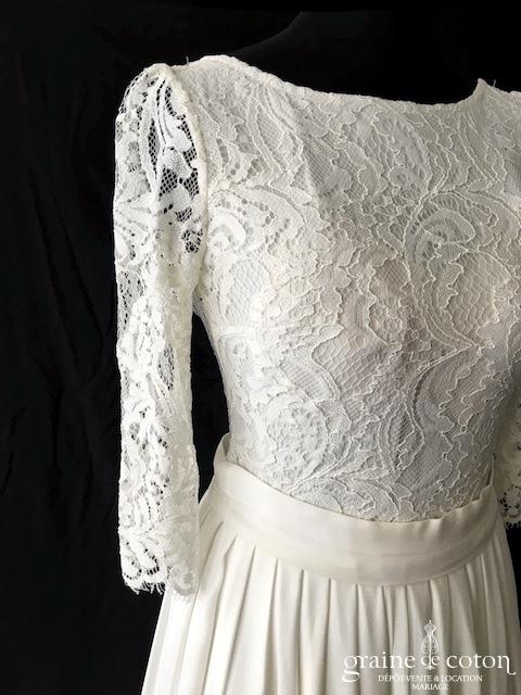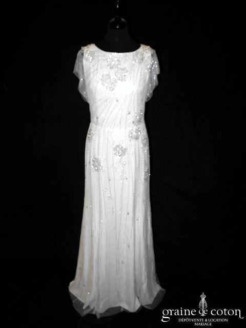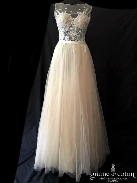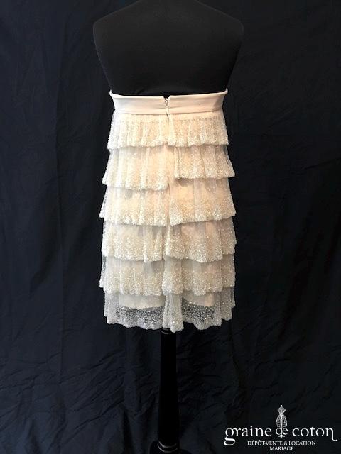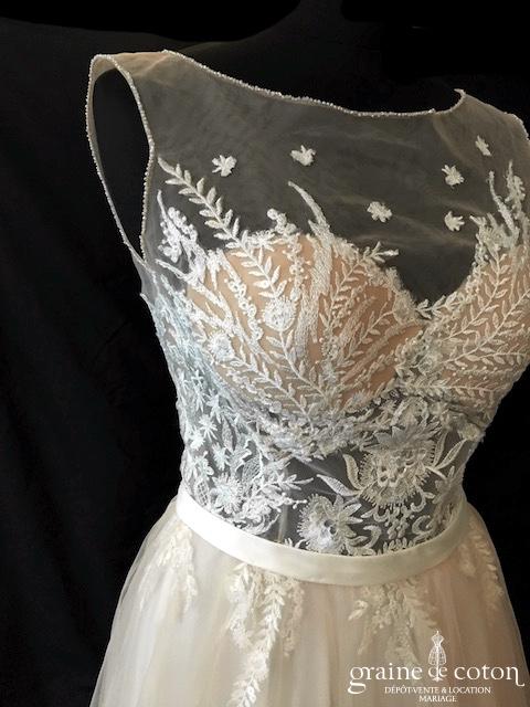 Robe une pièce tout en dentelle et perles ivoire clair : top à fines bretelles décolleté V profond et dos nu. Jupe fourreau légèrement évasée taille haute avec longue traîne …