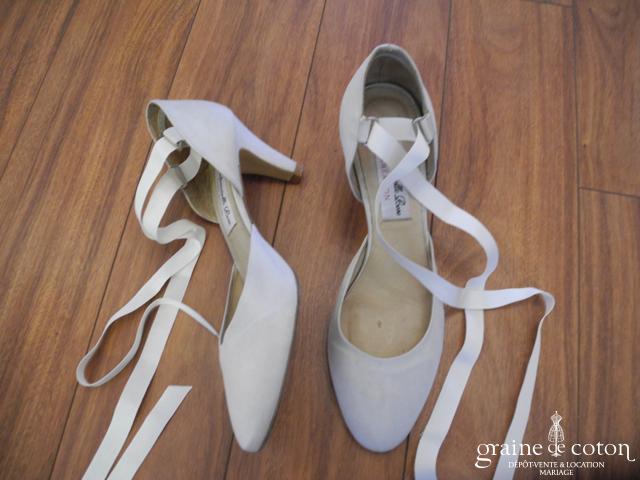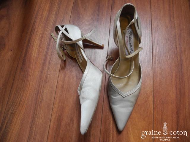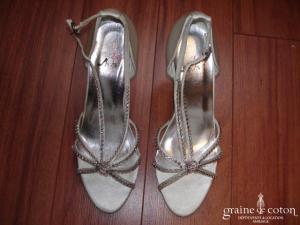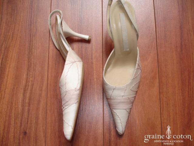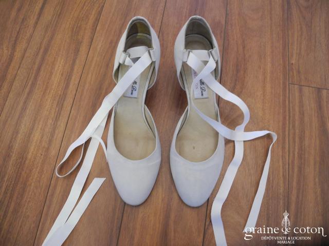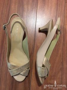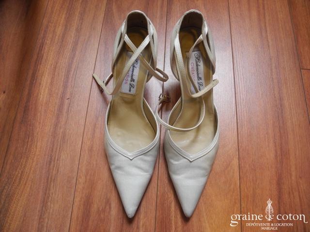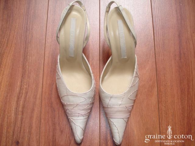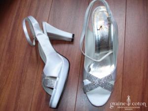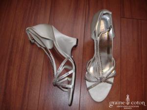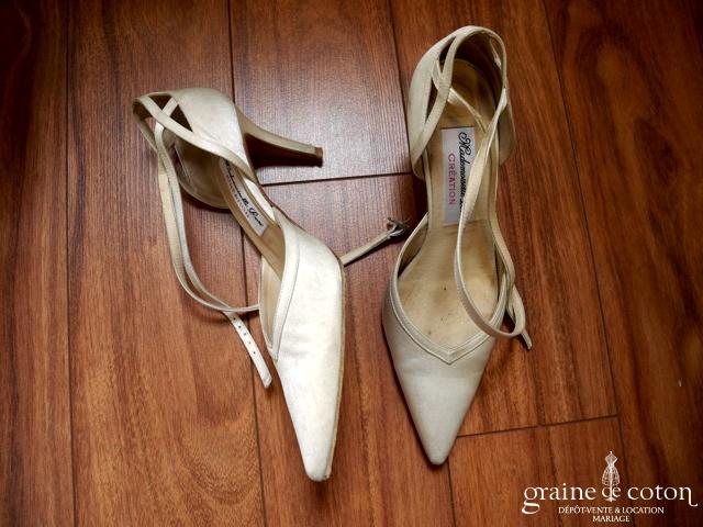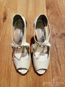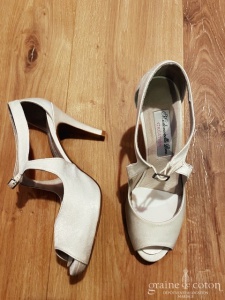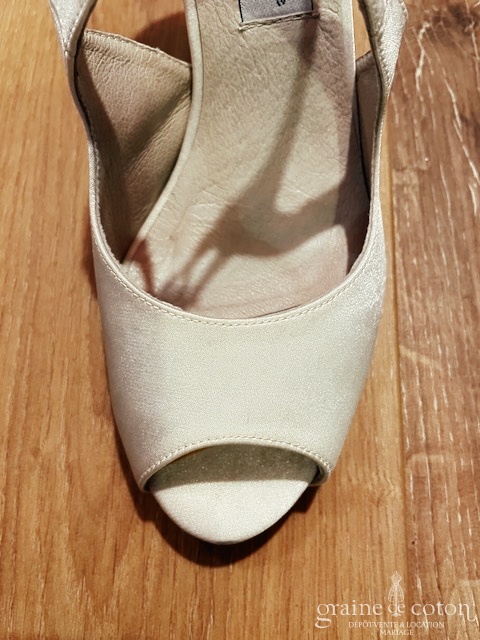 Sandales La Bastille en satin ivoire, bout ouvert. Originales et confort. Talon de 9 cm.
