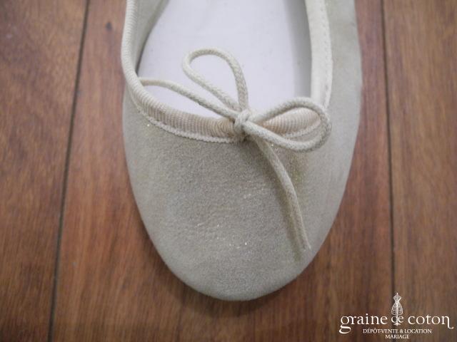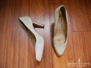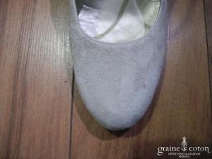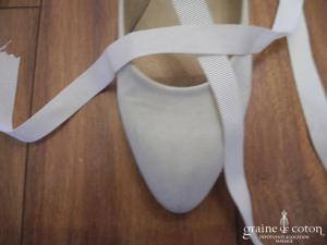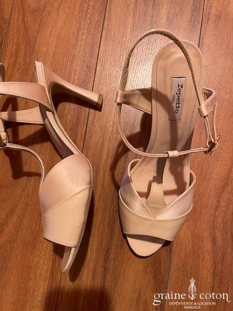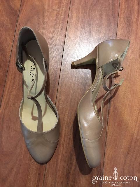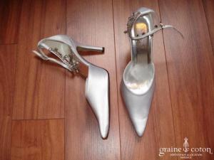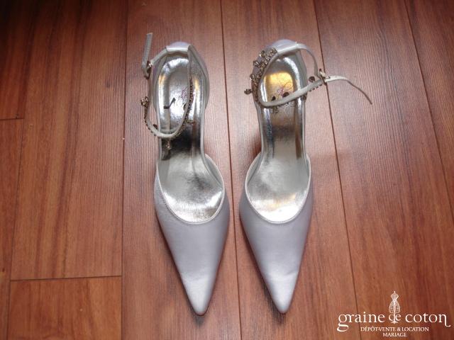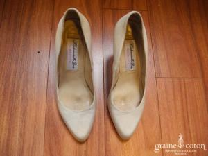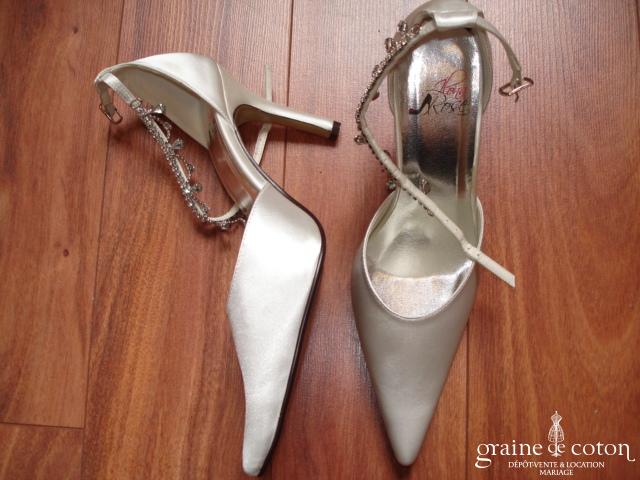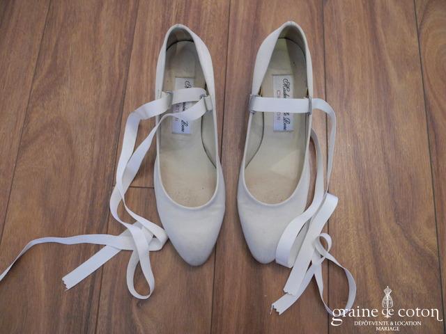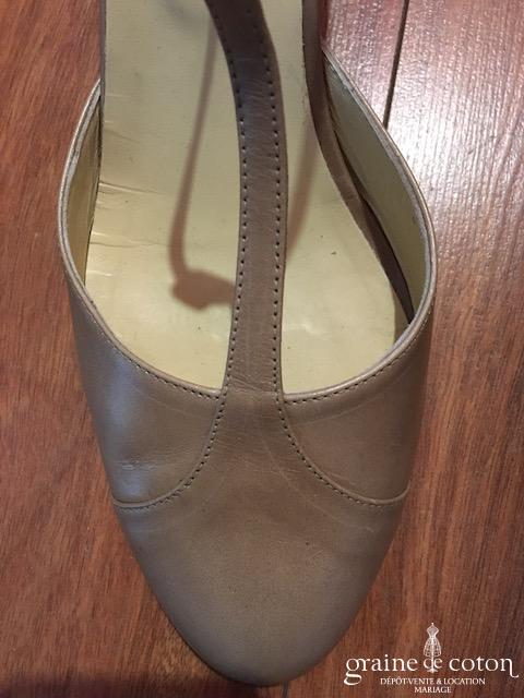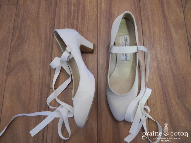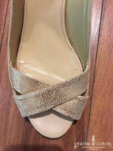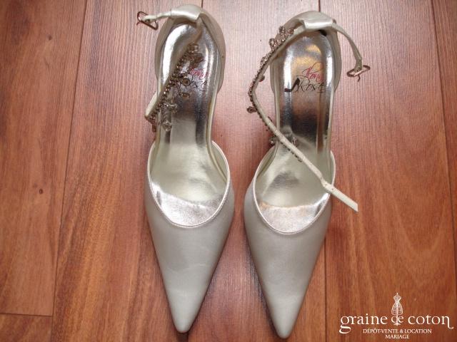 Sandales La Bastille en satin ivoire, bout ouvert. Originales et confort. Talon de 9 cm.