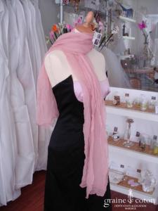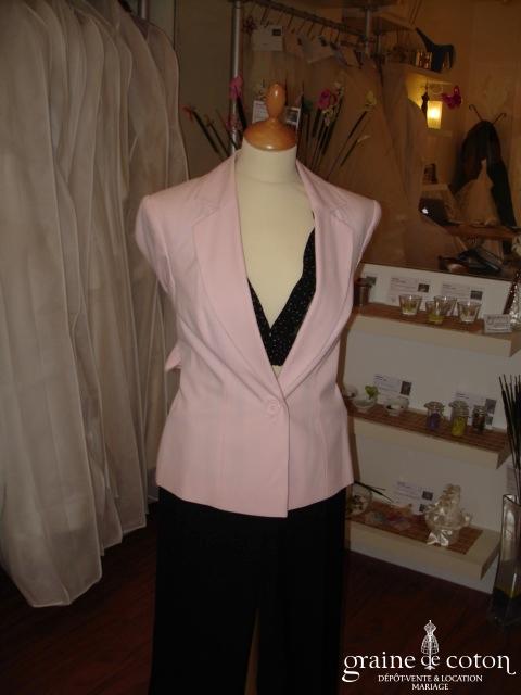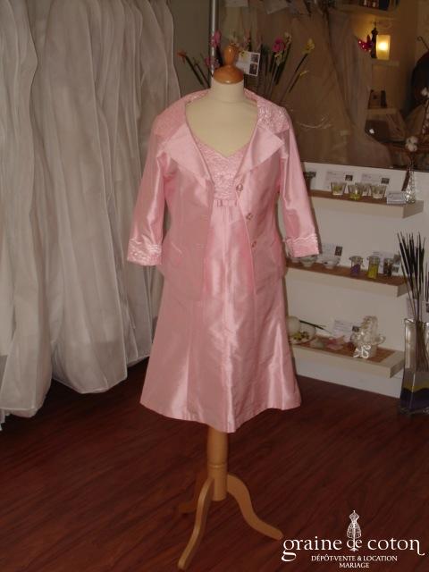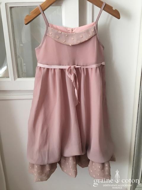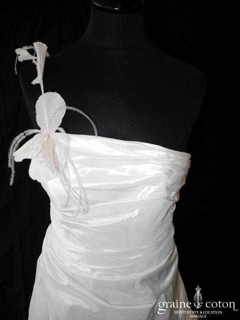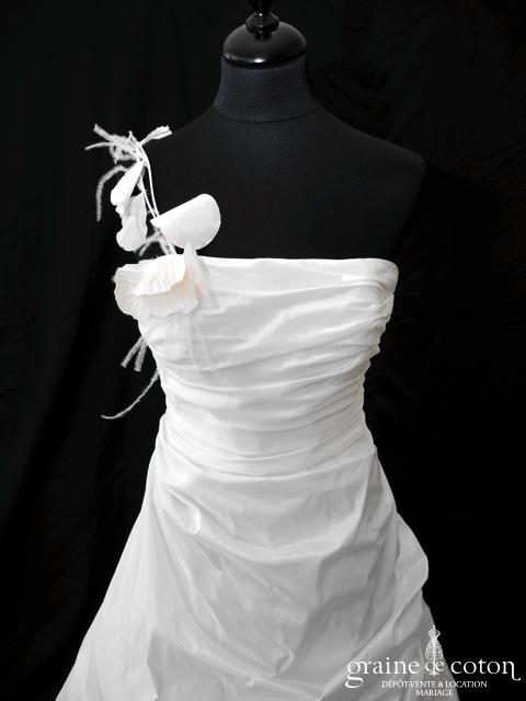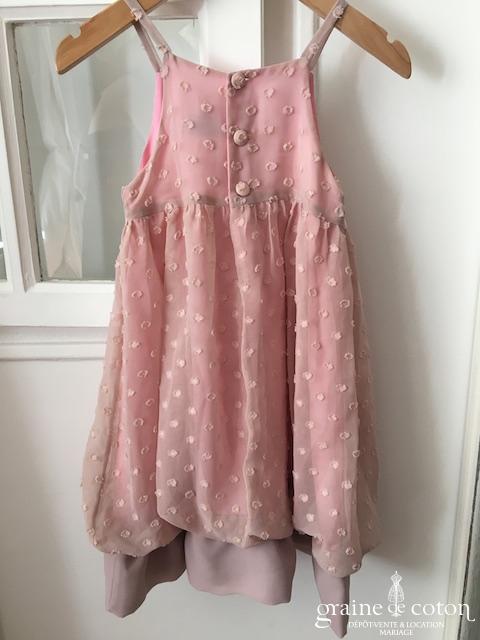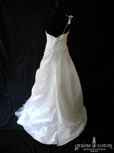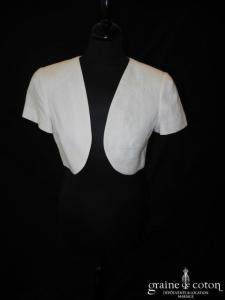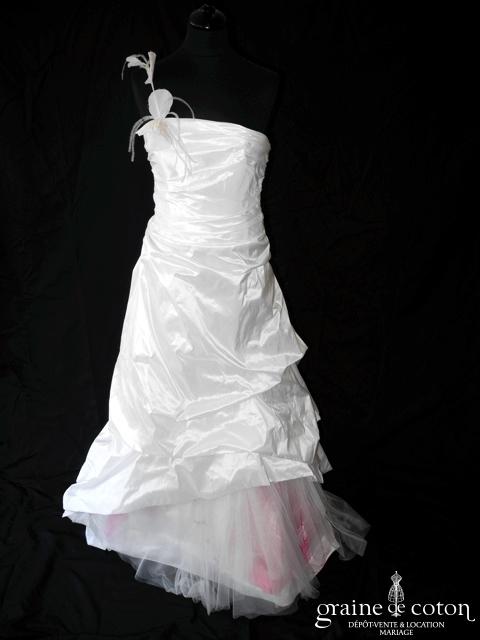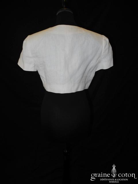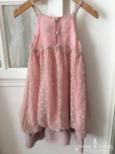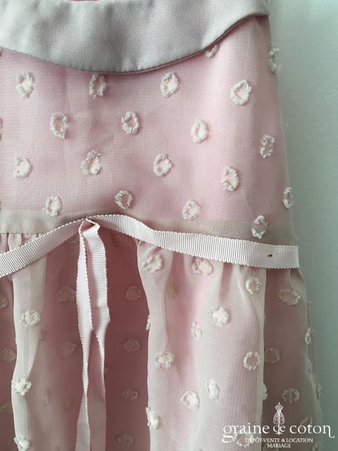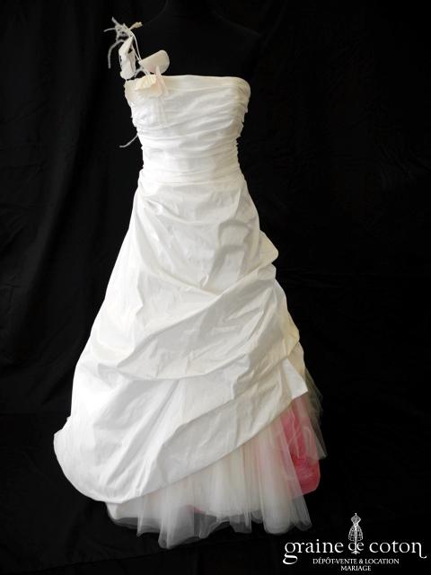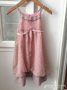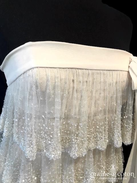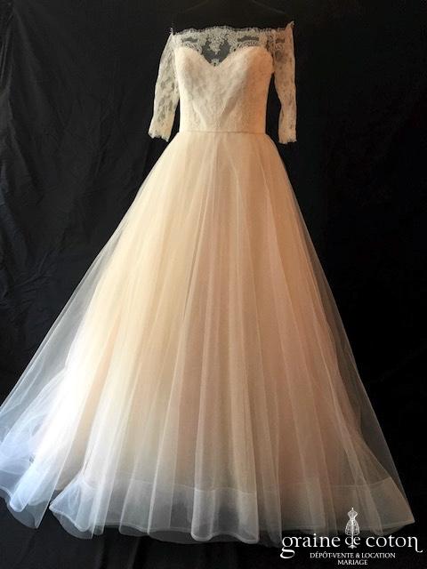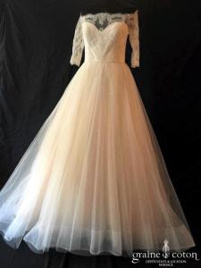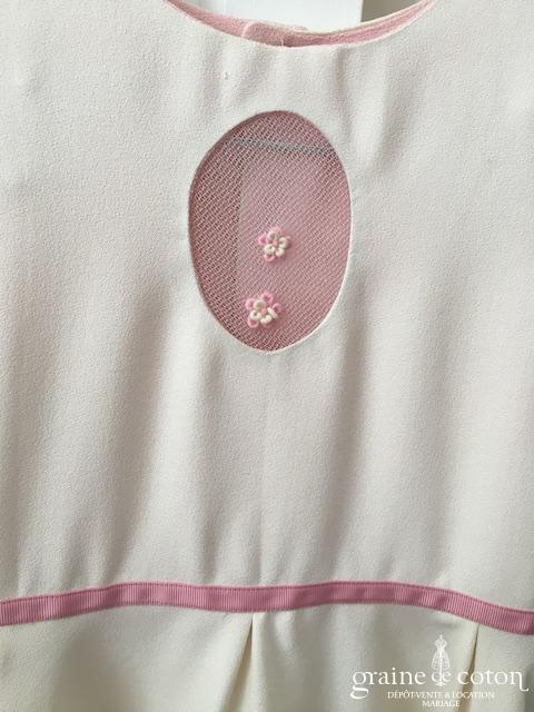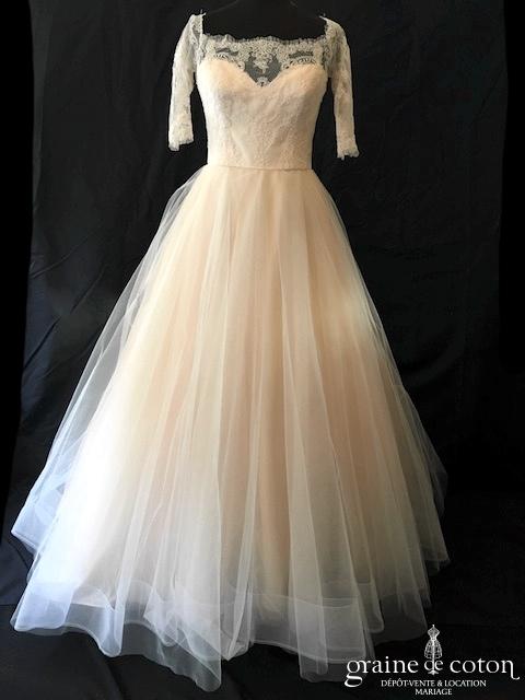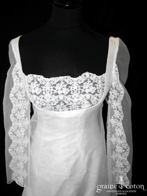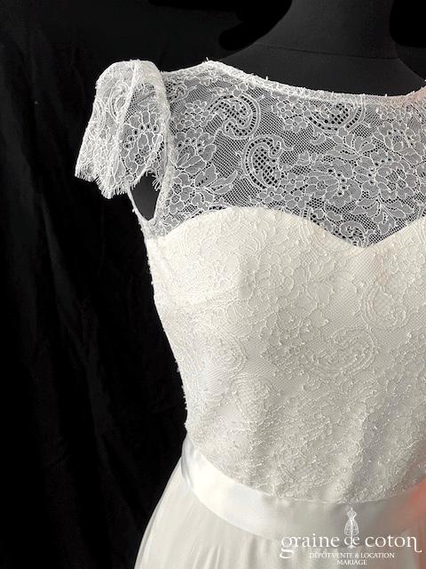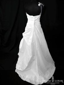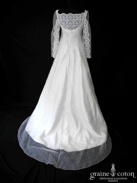 Robe deux pièces en tulle blanc : top droit bateau avec manches 3/4 effet ballon, doublé de coton. Jupe taille haute patineuse, longueur midi (entre la cheville et mi mollet), …