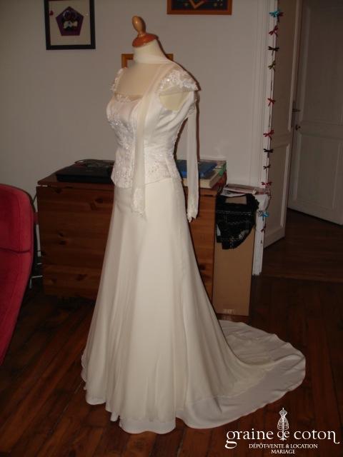Robe crème en 2 pièces : bustier délicatement perlé et brodé, jupe en mousseline de soie pour un mouvement tout en délicatesse. La traîne peut se remonter en drapé. Jupon …