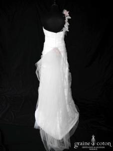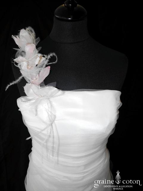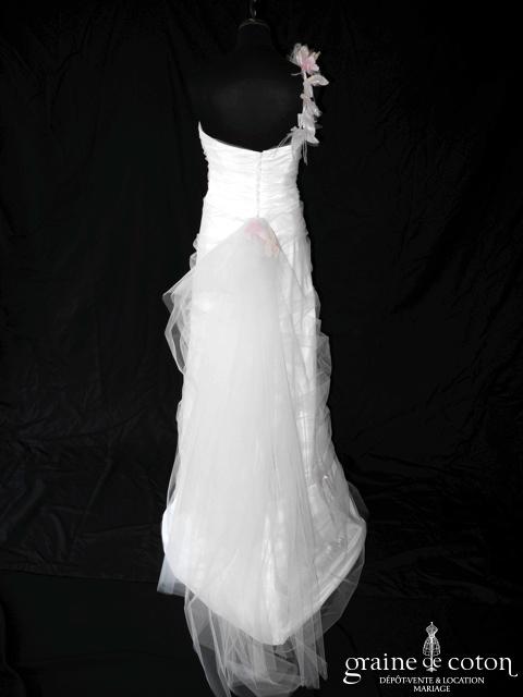 Robe demoiselle d’honneur blanche avec bustier roses en organza et jupe en tulle.