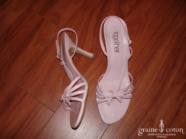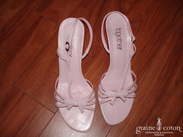 Sandales à lanières et petit noeud, entièrement en cuir. Talons de 10 cm. Couleur rose pâle.