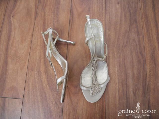 Chaussures d’exception, vendues uniquement chez les grands créateurs. Sandales argent 3 bandes sur le pied en strass Swarovski. Semelle en cuir. Talon 3 cm. Talon 10 cm.