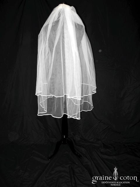 Voile court en tulle blanc bordé d’un biais de satin. Monté sur peigne, avec rabat avant.