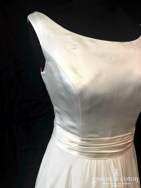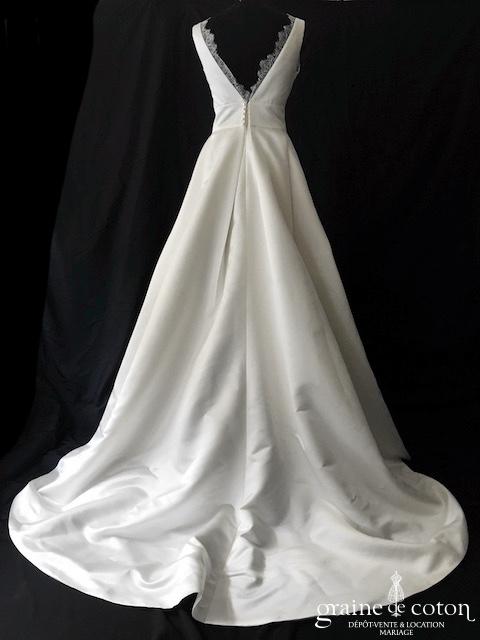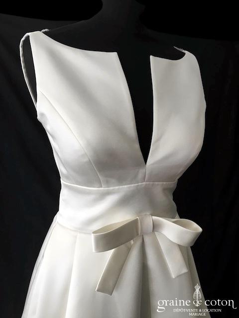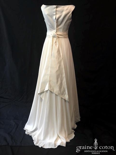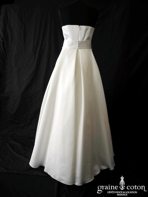 Voile long de 2 mètres en tulle ivoire bordé d’un biais de satin. Monté sur peigne, avec rabat avant.