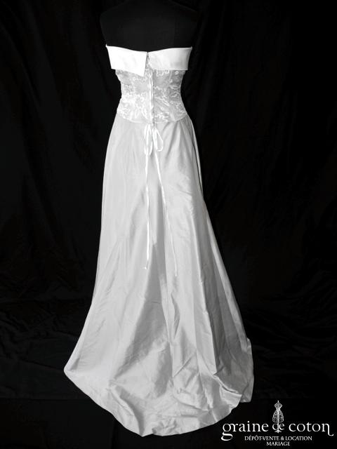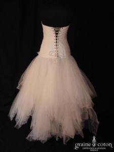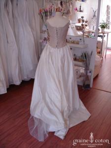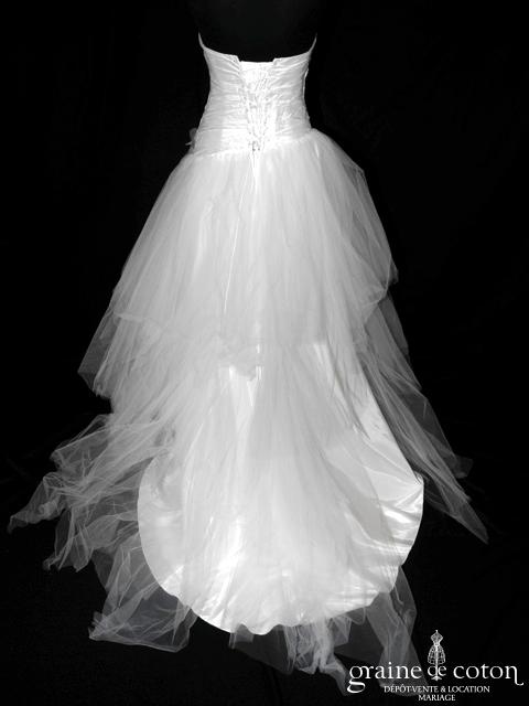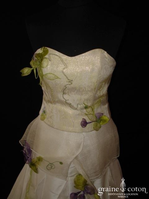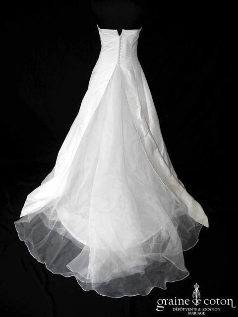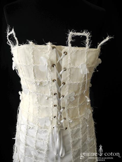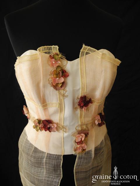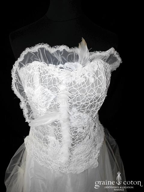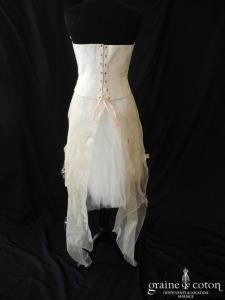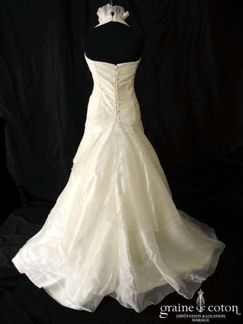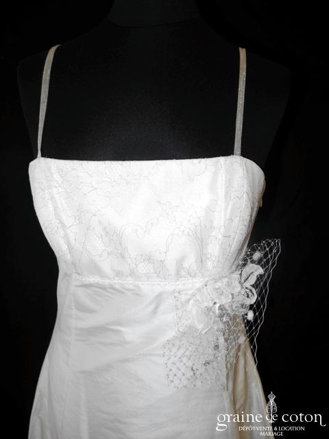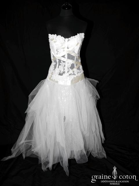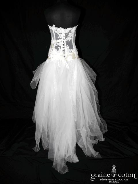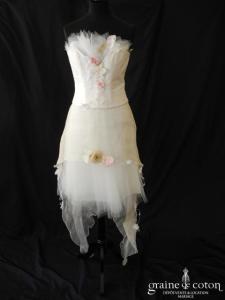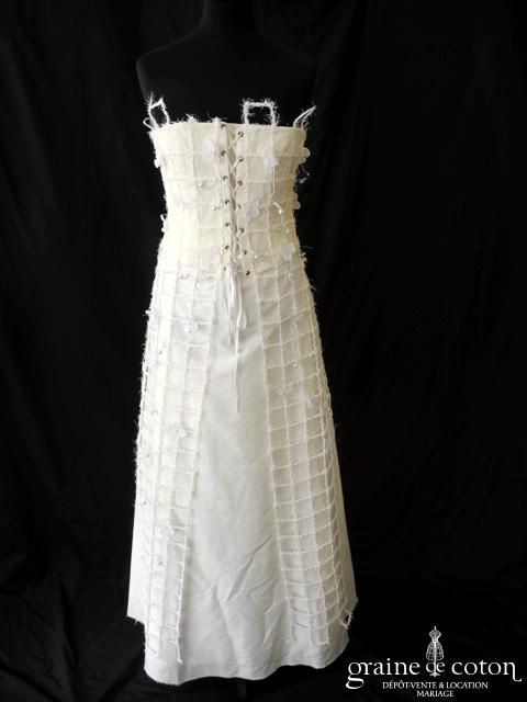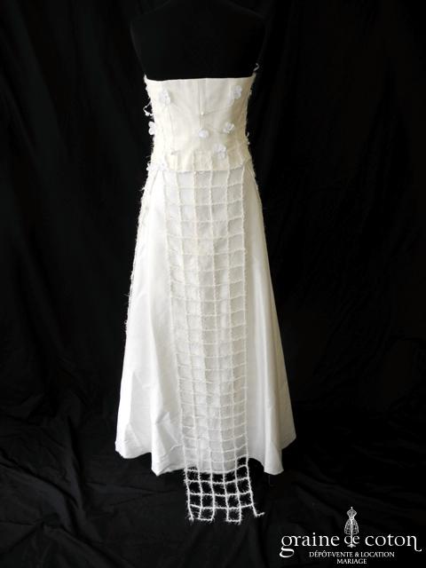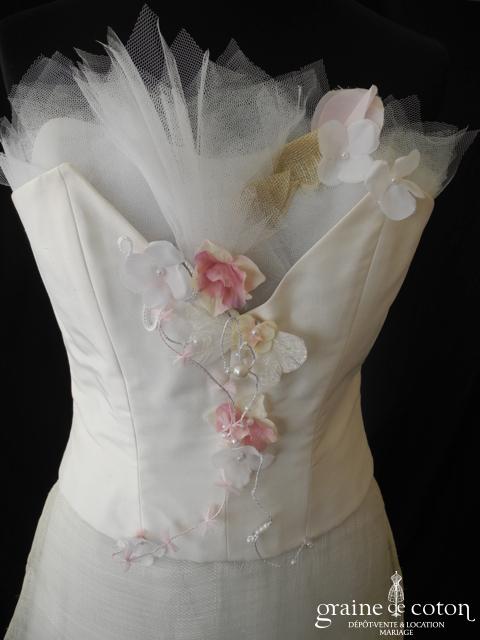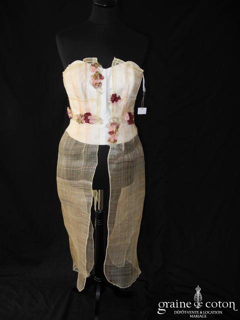 Robe une pièce ivoire : bustier baleiné en soie sauvage et voile transparent, dos ouvert lacé. Jupe longue près du corps en tissu brodé et jupon de tulle apparent sur …