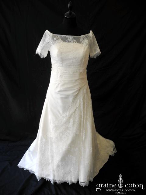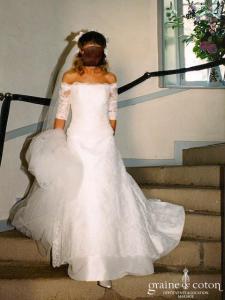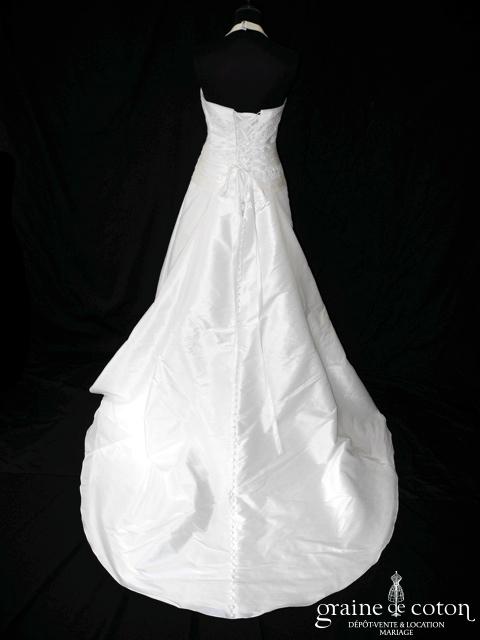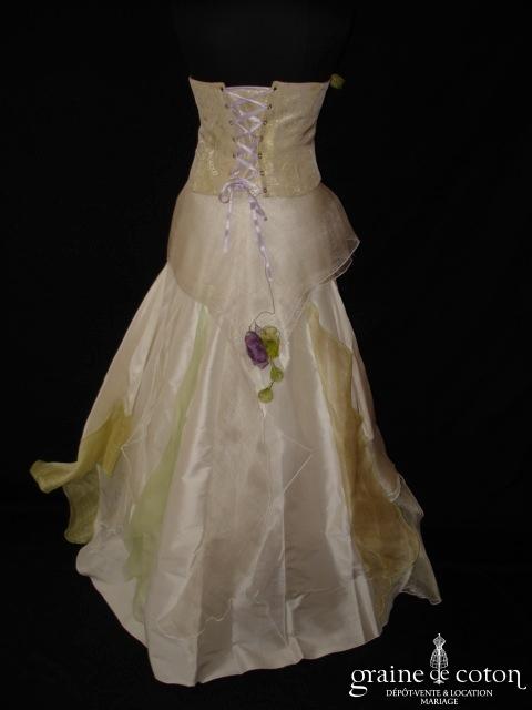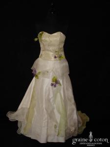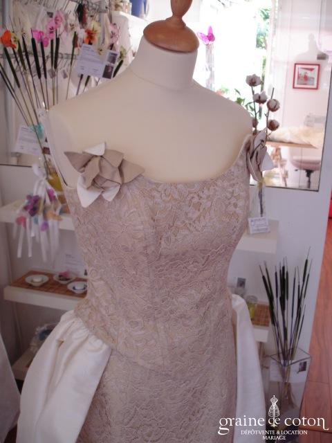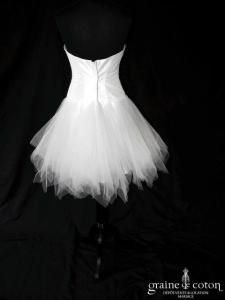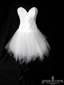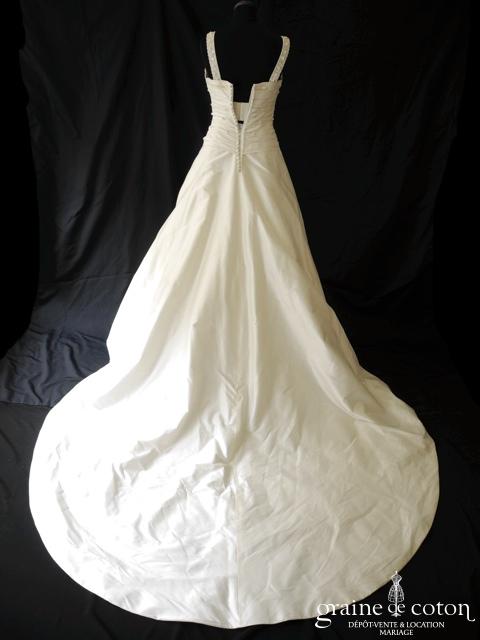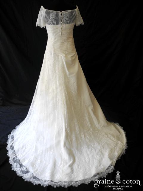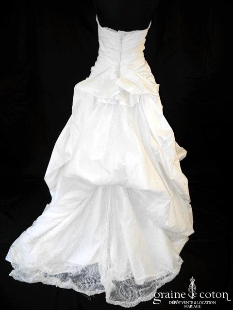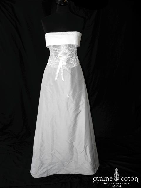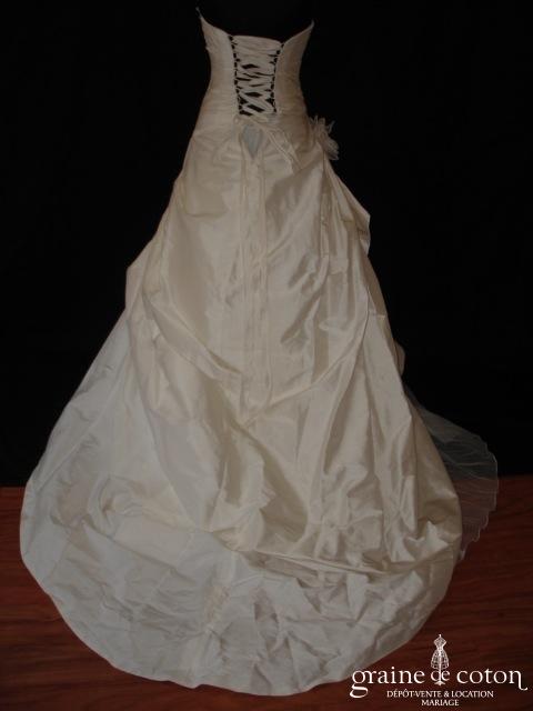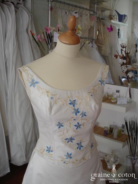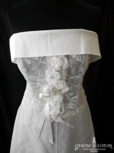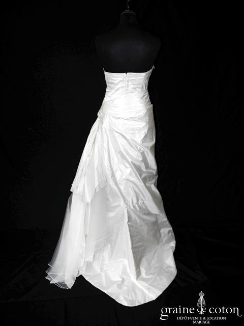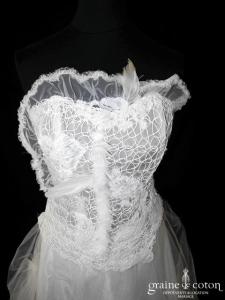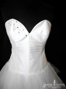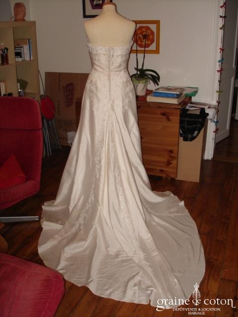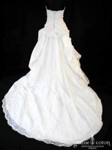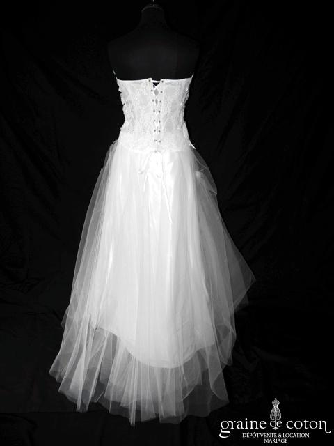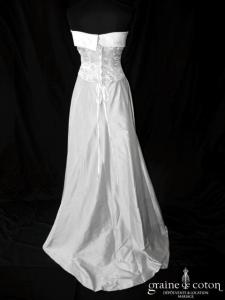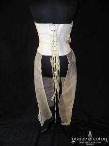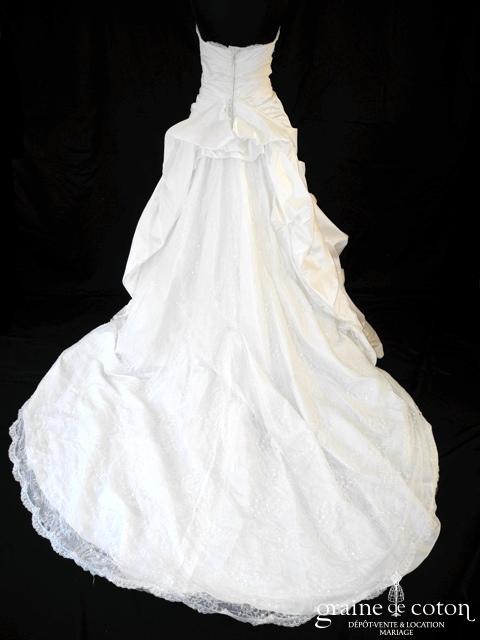 Robe une pièce ivoire : bustier baleiné en soie sauvage et voile transparent, dos ouvert lacé. Jupe longue près du corps en tissu brodé et jupon de tulle apparent sur …