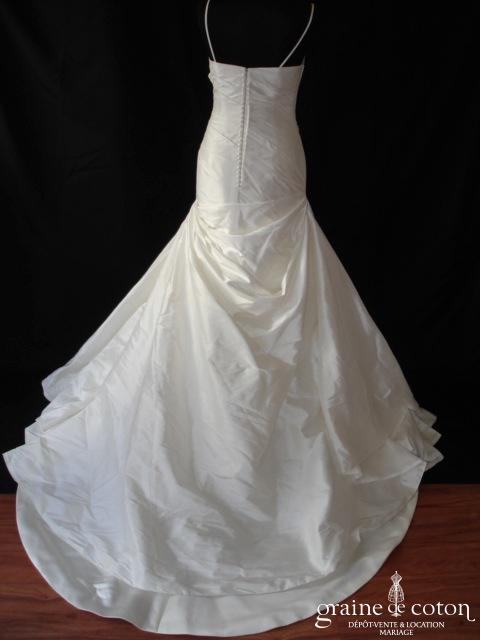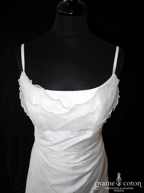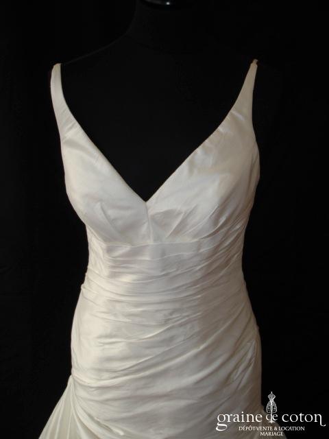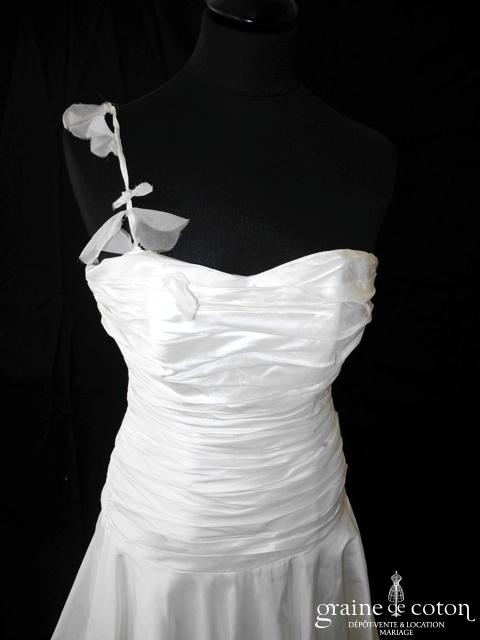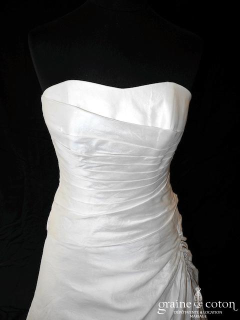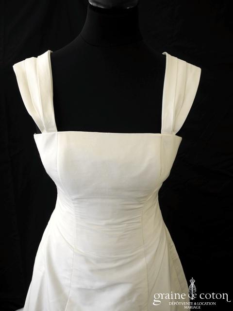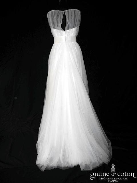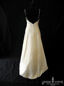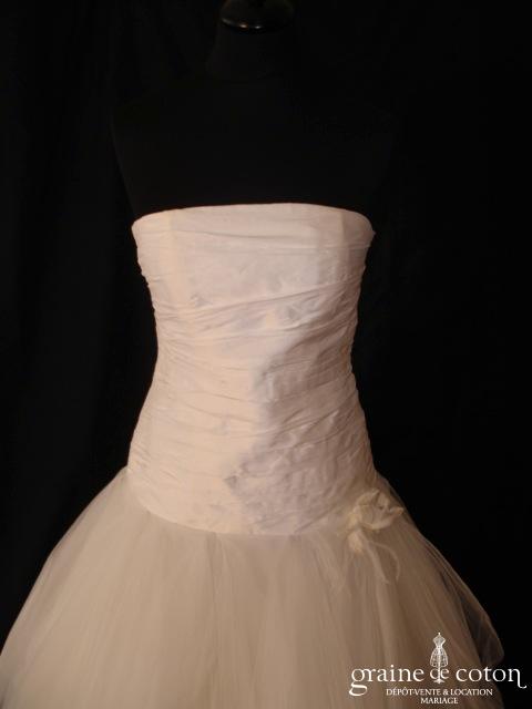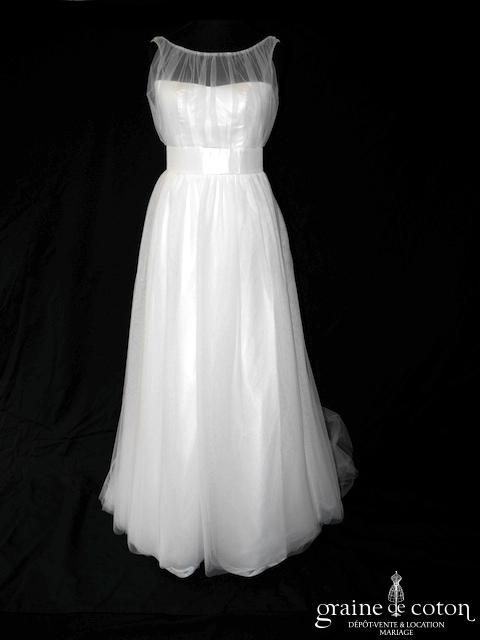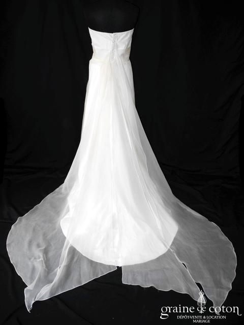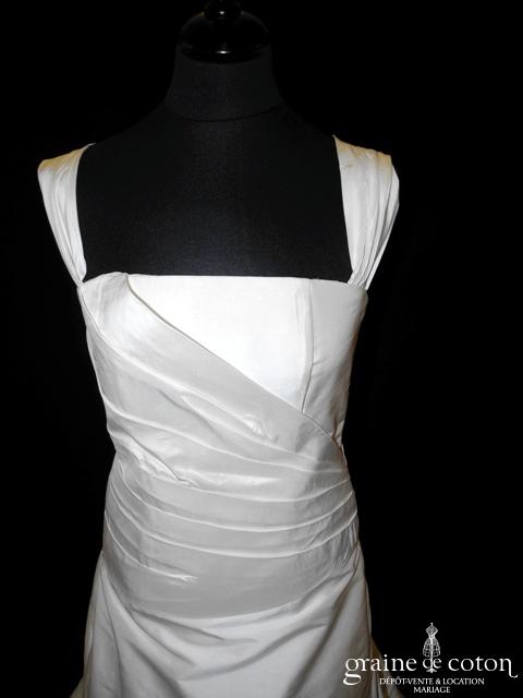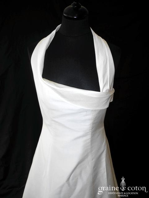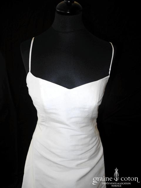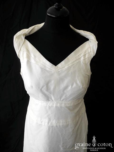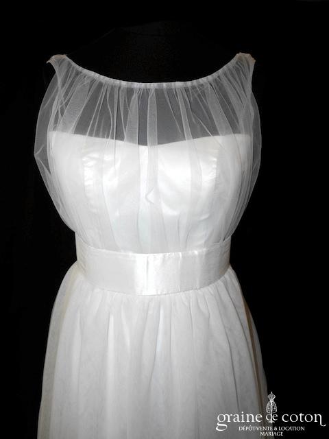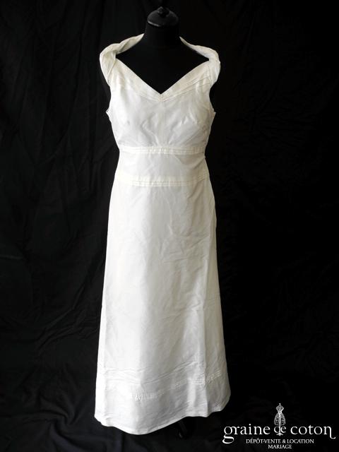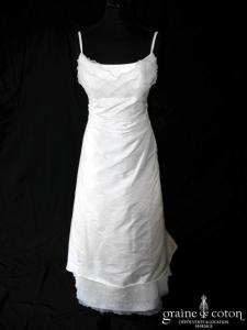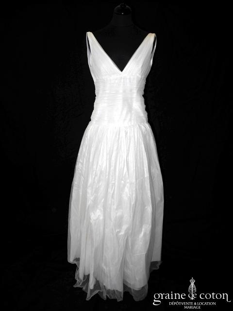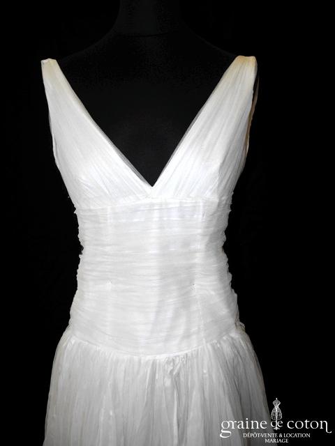 Robe une pièce en soie sauvage blanc drapée de tulle de soie ivoire. Bustier empire avec bretelles formant un décolleté en V, drapé à la taille. Jupe taille basse avec …