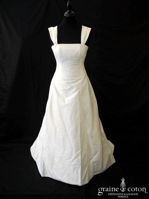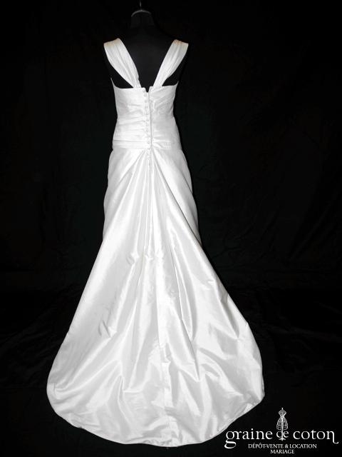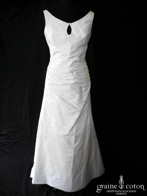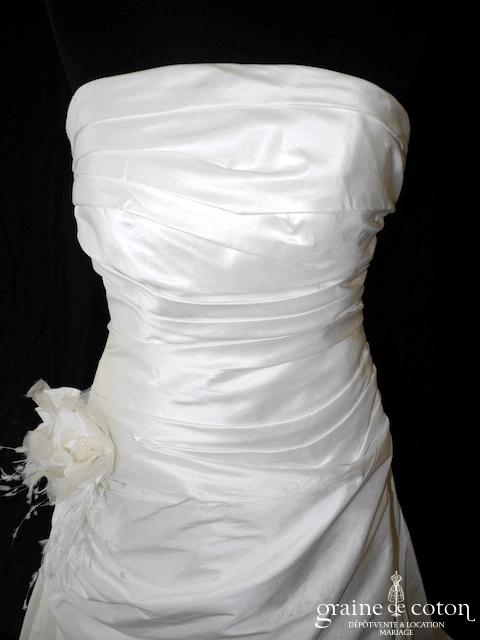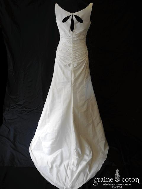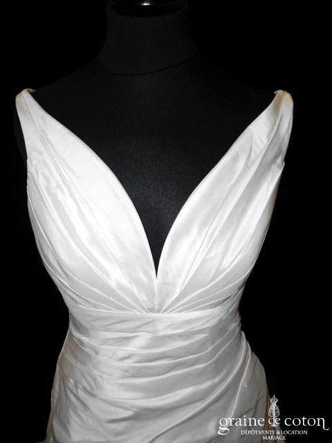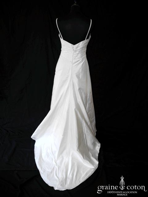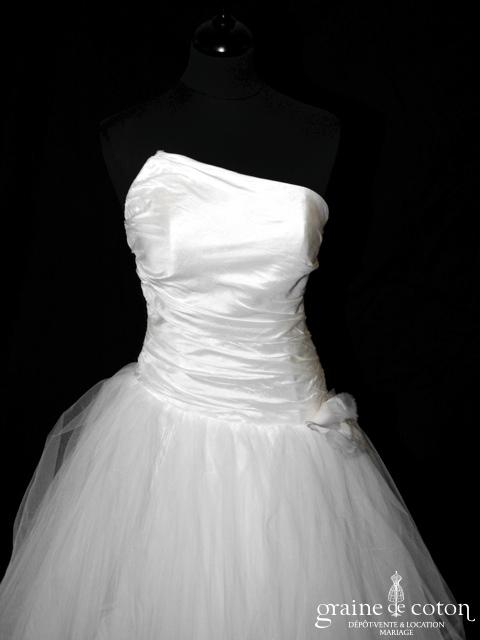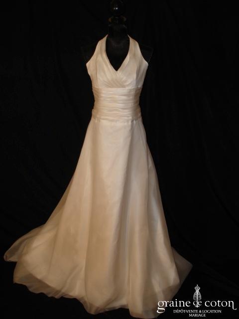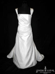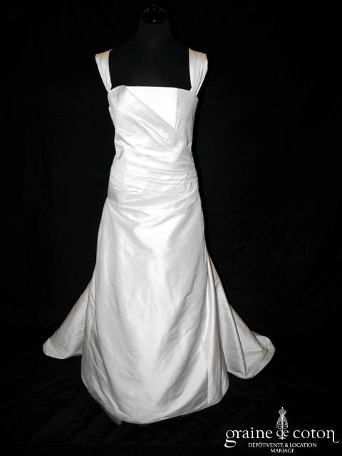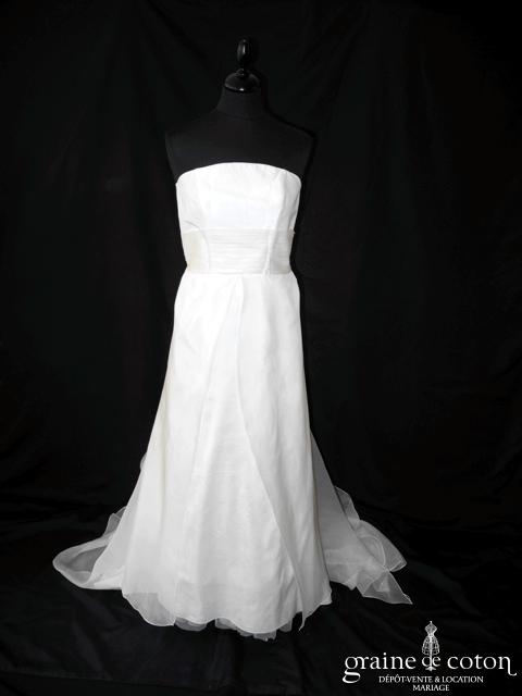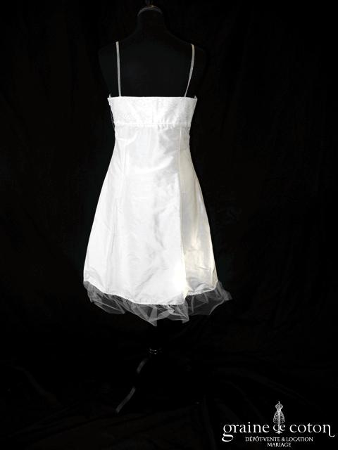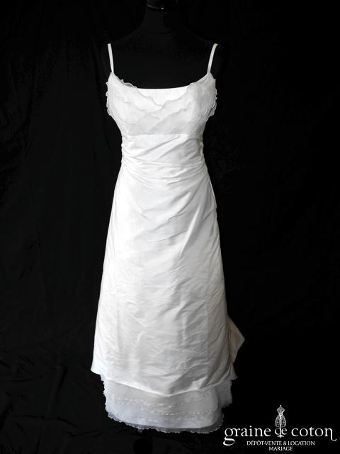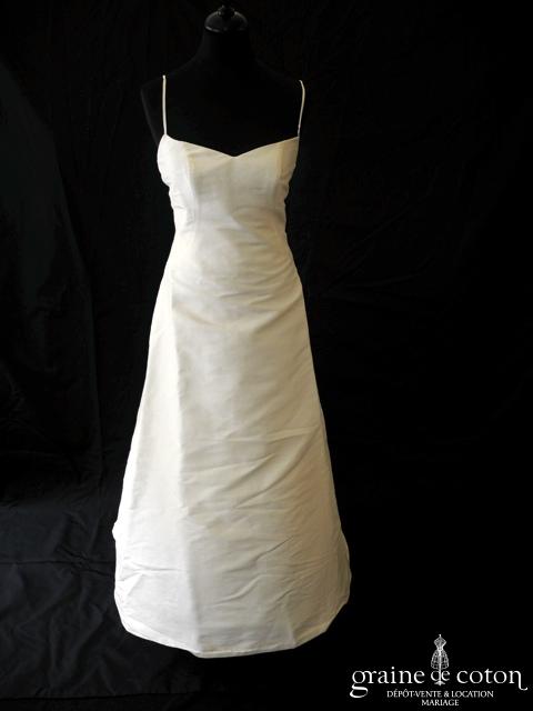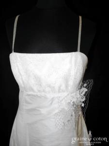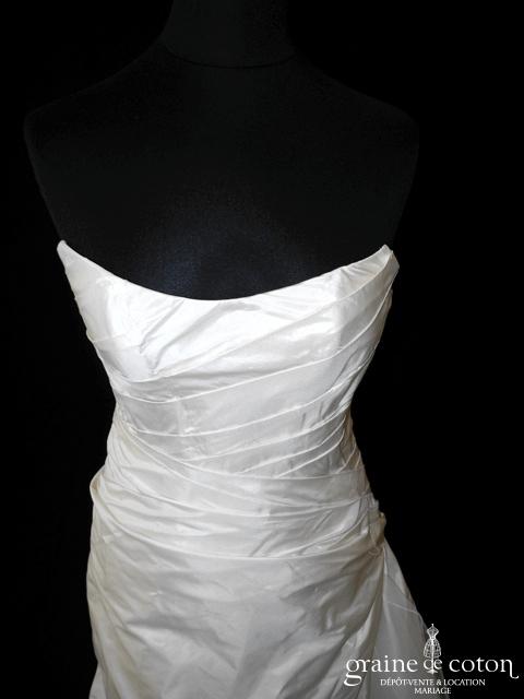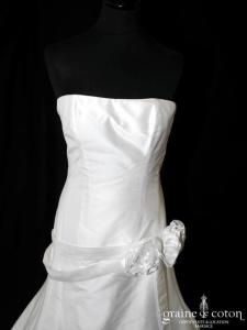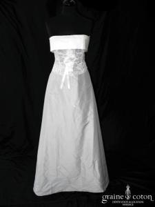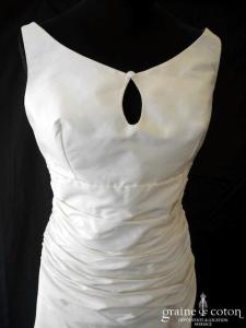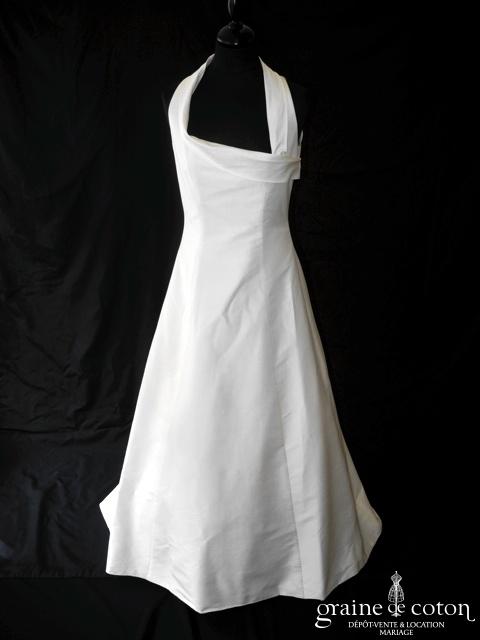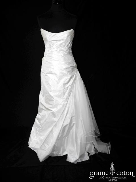 Robe une pièce en soie sauvage blanc drapée de tulle de soie ivoire. Bustier empire avec bretelles formant un décolleté en V, drapé à la taille. Jupe taille basse avec …