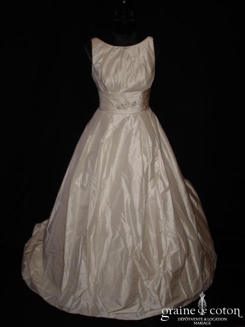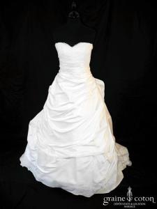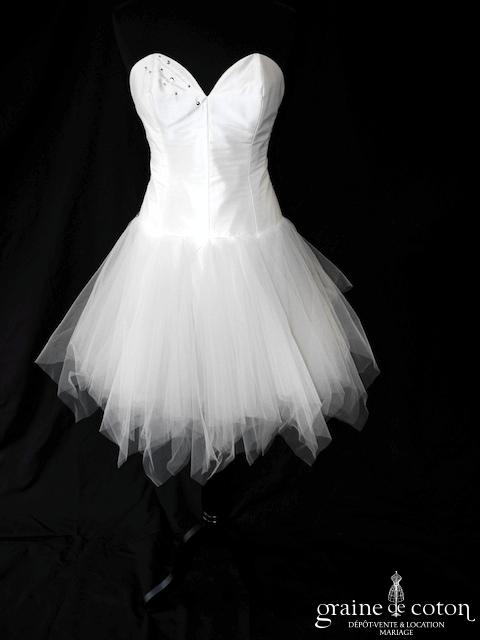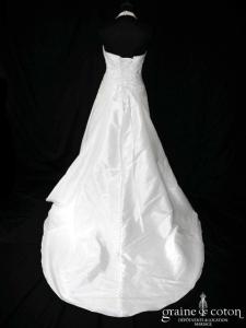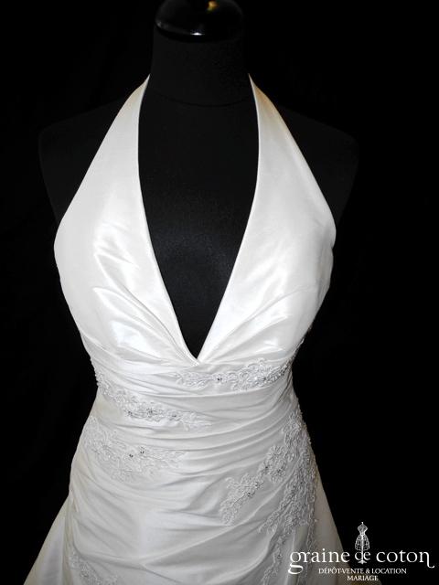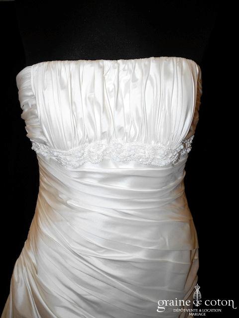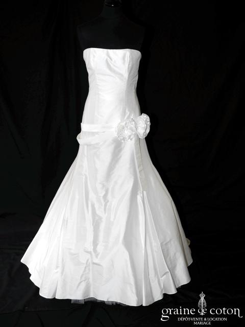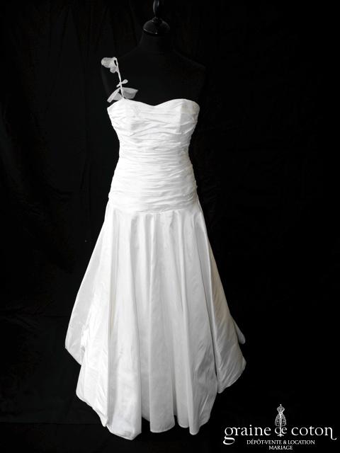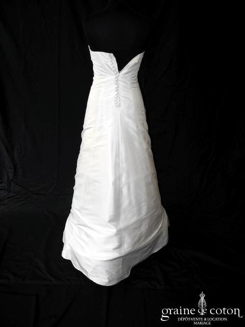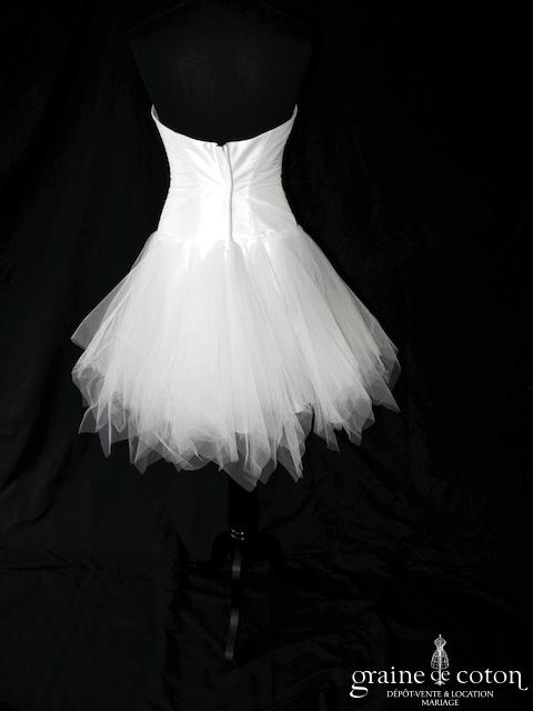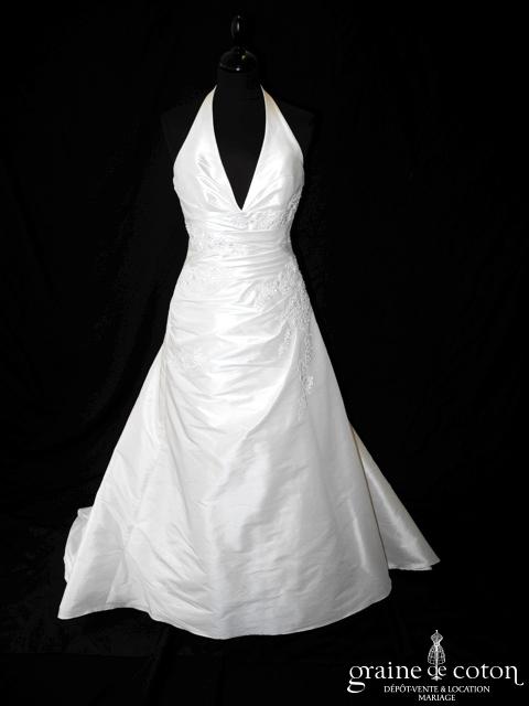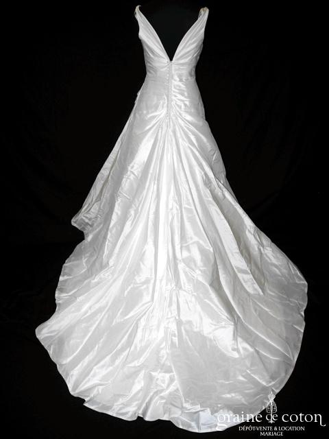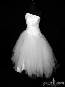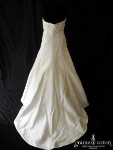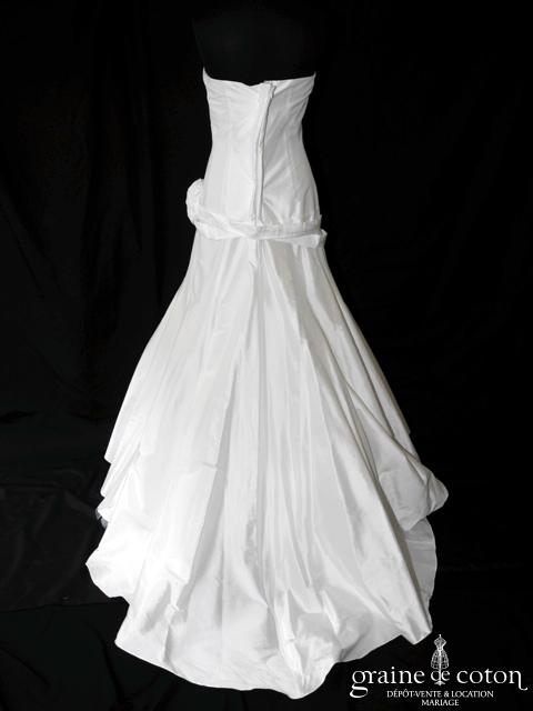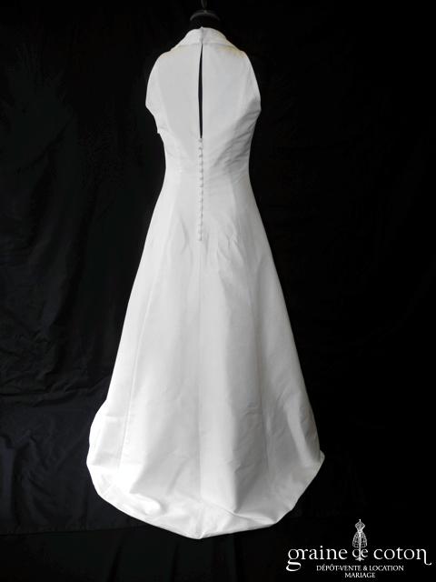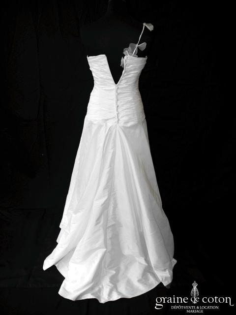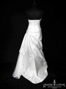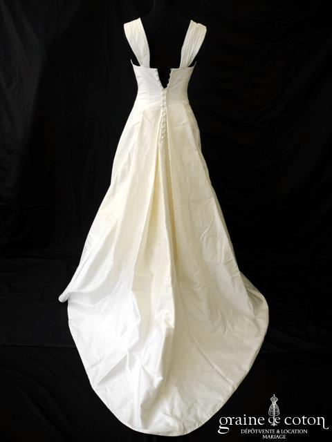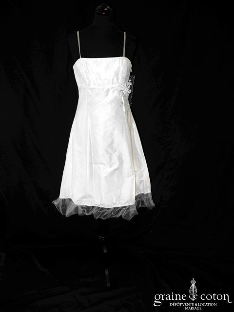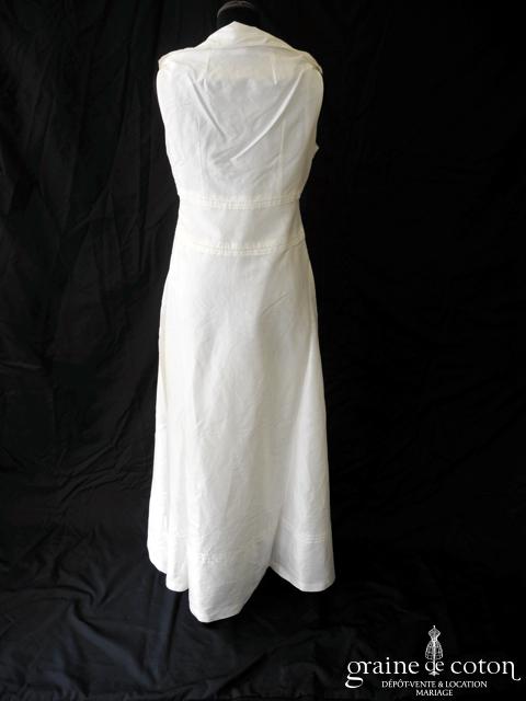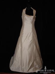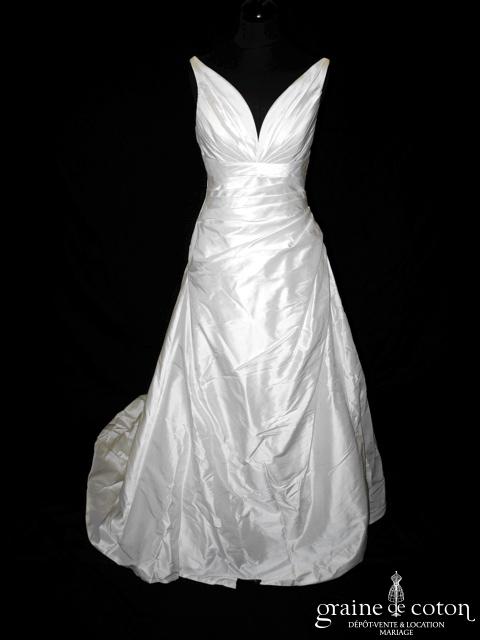 Robe une pièce en soie sauvage blanc drapée de tulle de soie ivoire. Bustier empire avec bretelles formant un décolleté en V, drapé à la taille. Jupe taille basse avec …