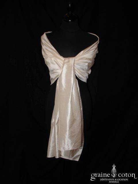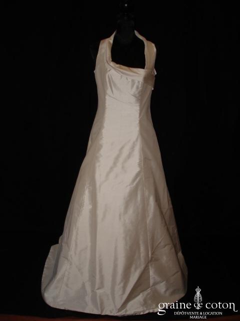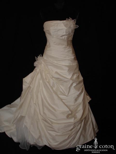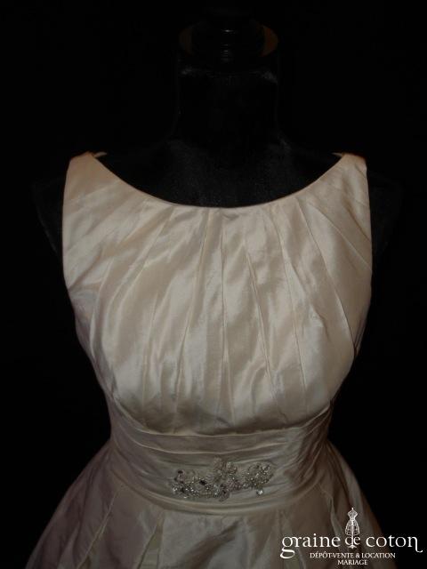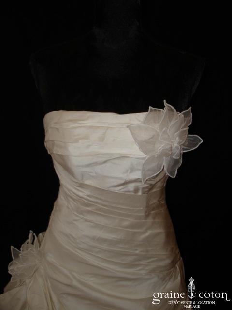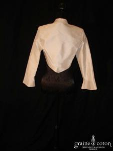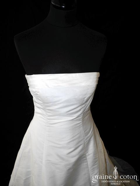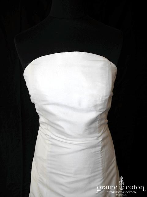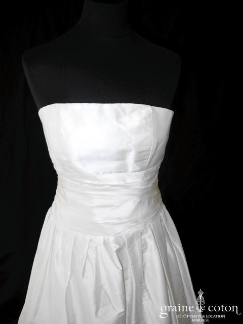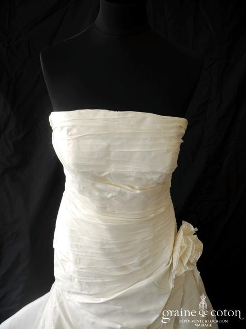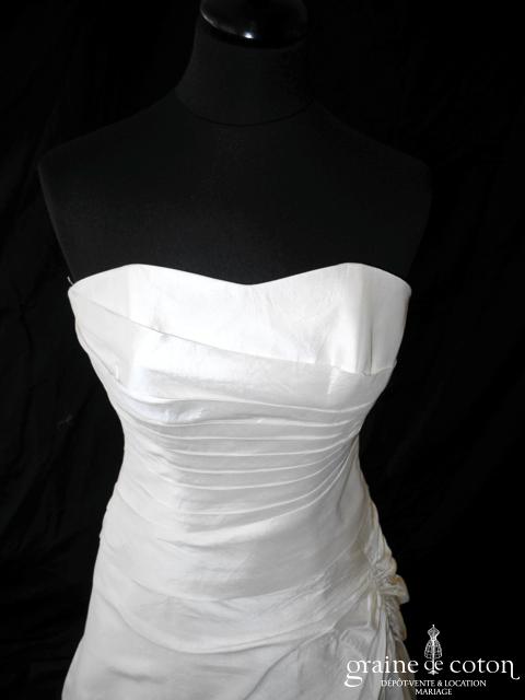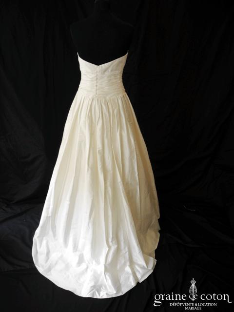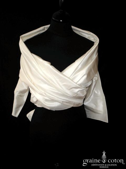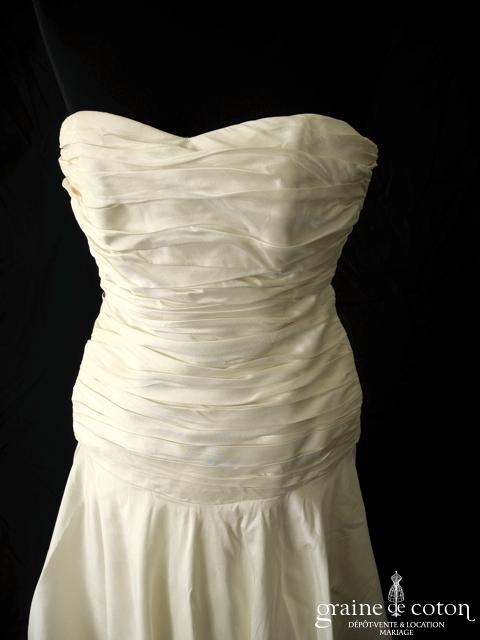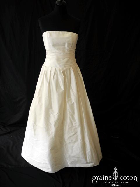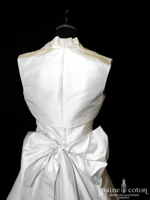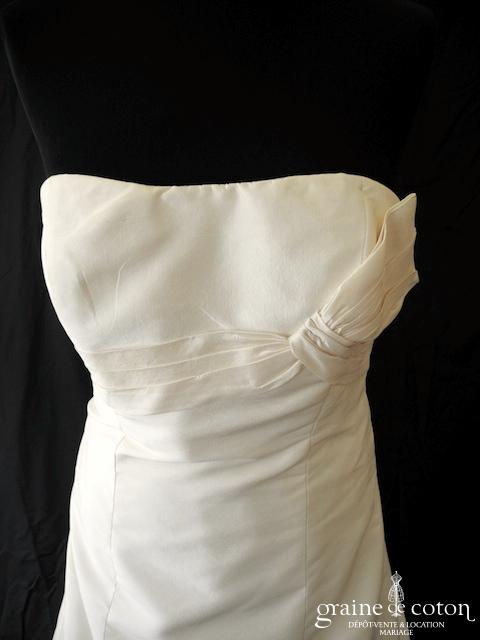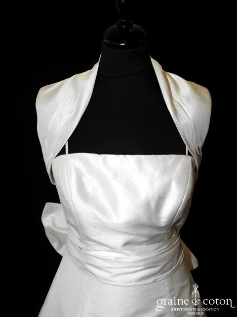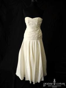 Robe trois pièces entièrement en soie sauvage ivoire : bustier plissé à la taille, jupe s’ouvrant sur un pan de tulle et boléro asymétrique parfaitement assortis. Petite traîne. Simple et …