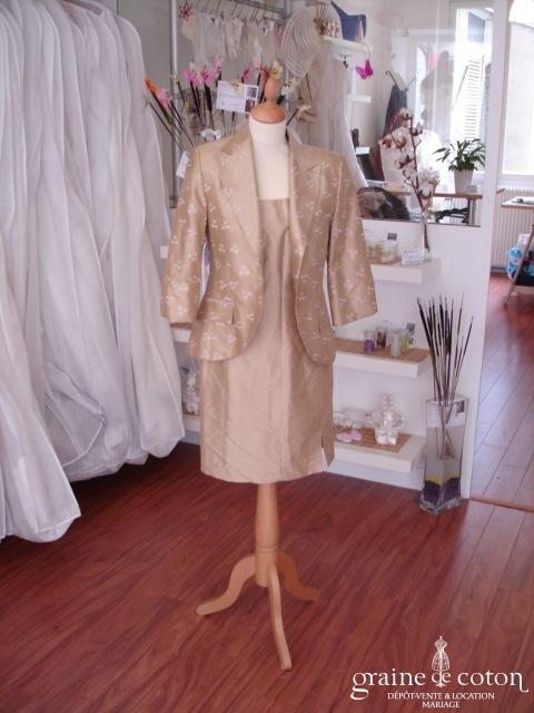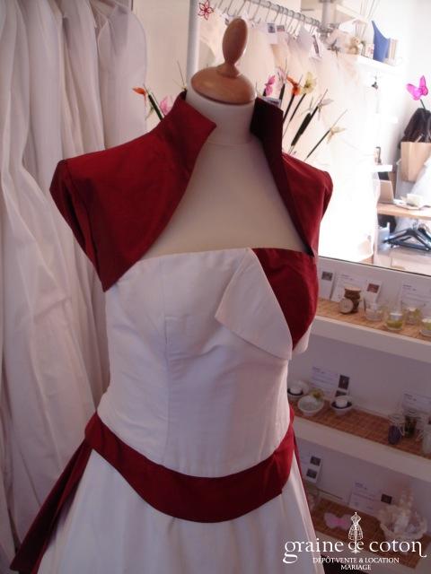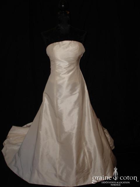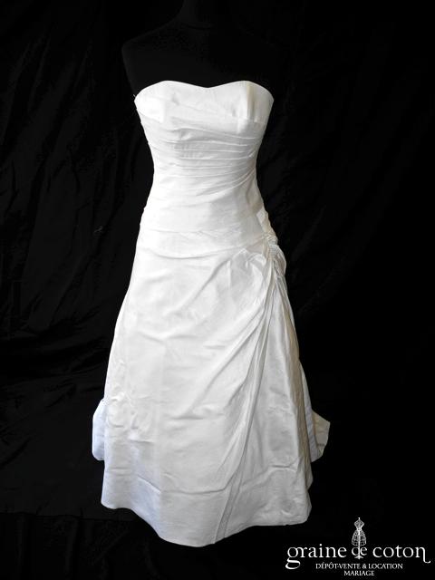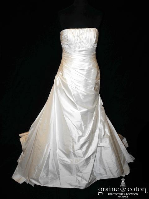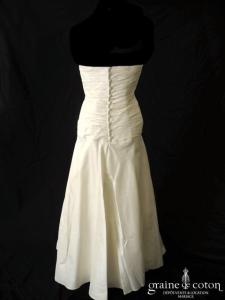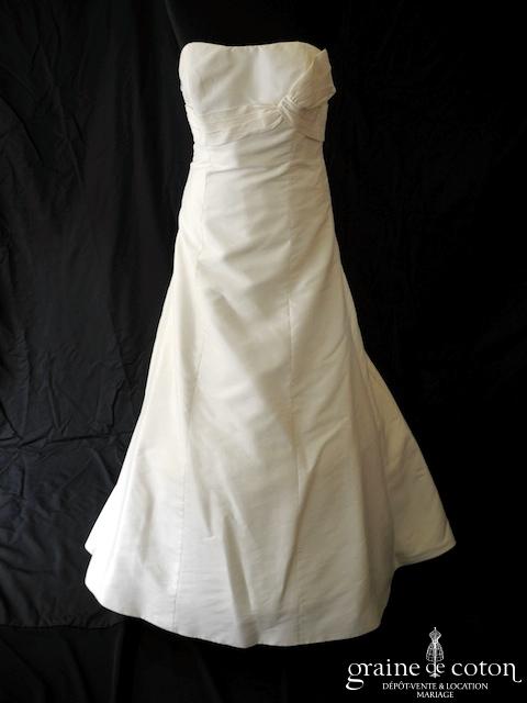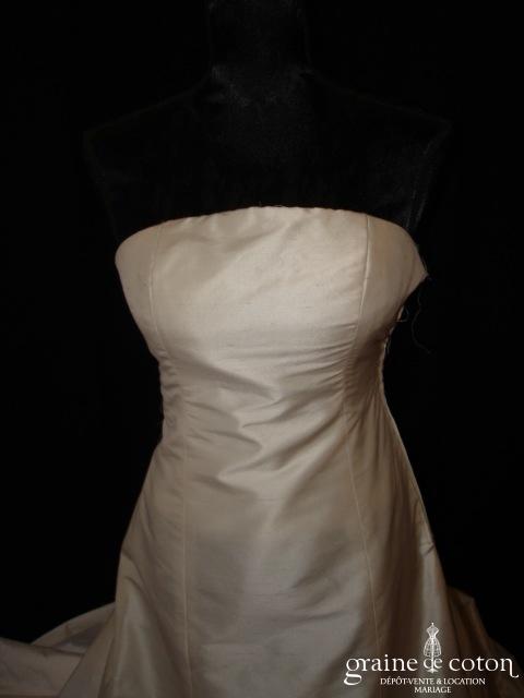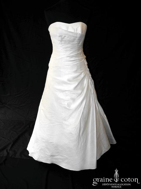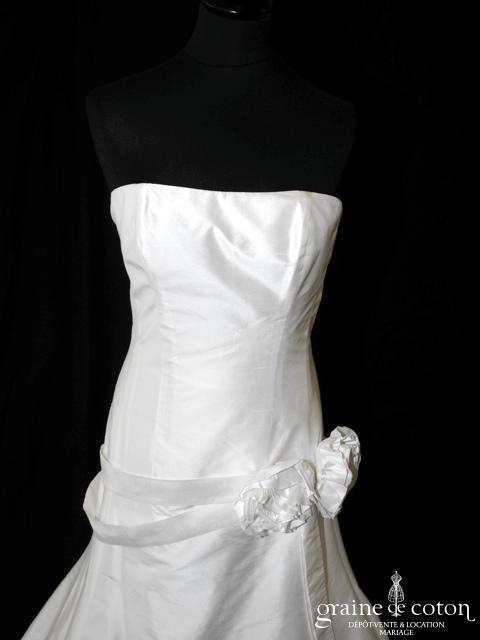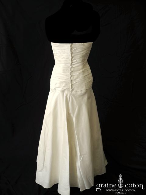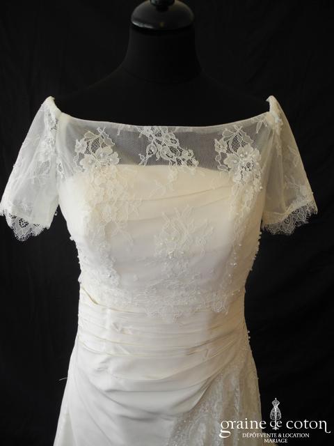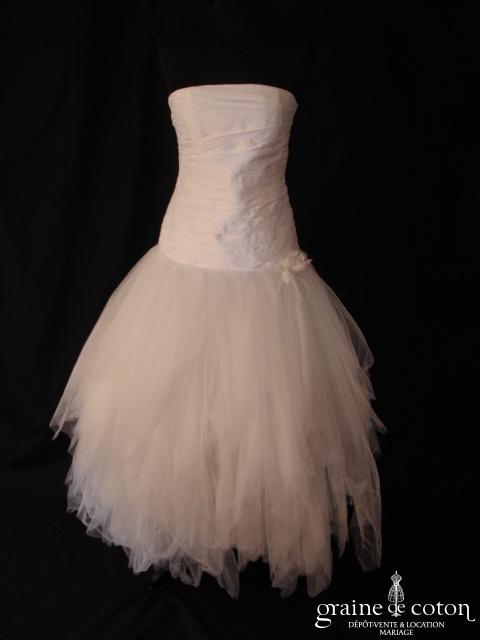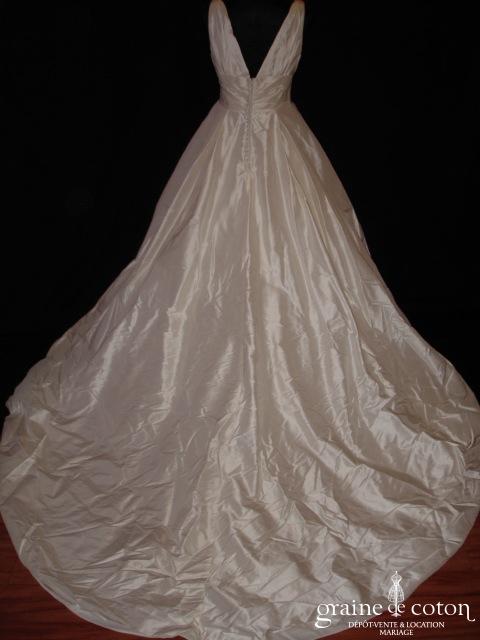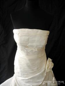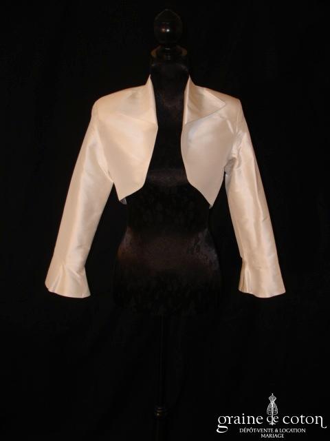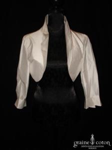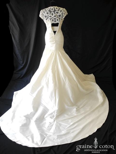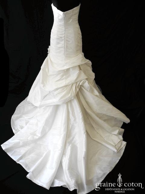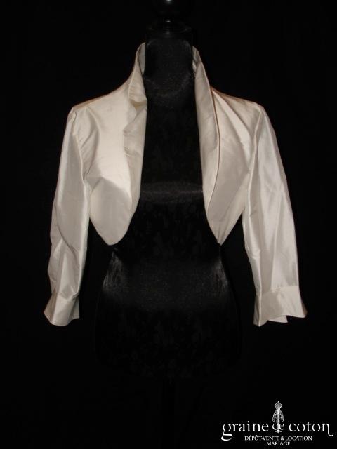 Robe trois pièces entièrement en soie sauvage ivoire : bustier plissé à la taille, jupe s’ouvrant sur un pan de tulle et boléro asymétrique parfaitement assortis. Petite traîne. Simple et …