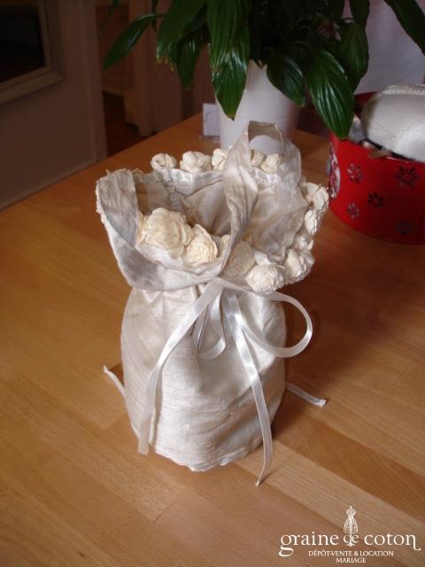 Coussin d’alliance forme coeur recouvert de soie sauvage ivoire et entouré de petites roses en tissu.
