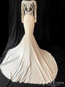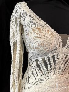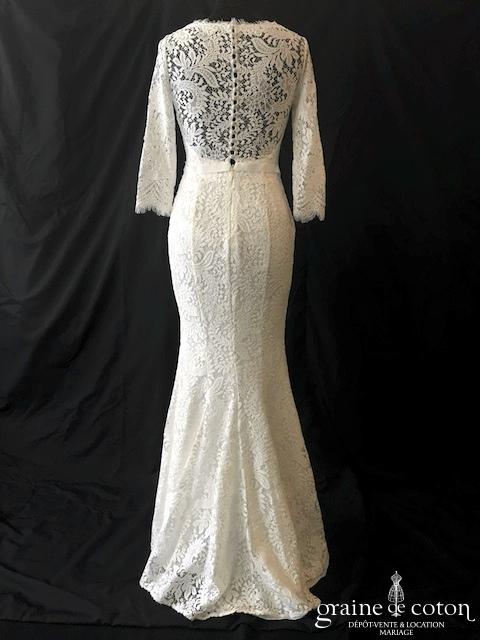Dépôt du modèle fourreau « Laëtitia » de La mariée parisienne, tout en guipure ivoire sur fond nude pour un effet tatouage. Glamour, fraîche et seyante. Taille 38, référence 5789.