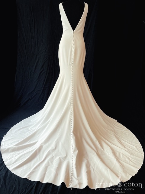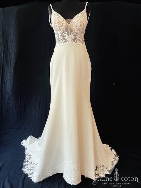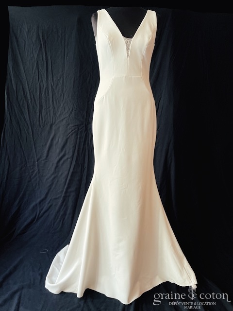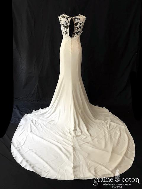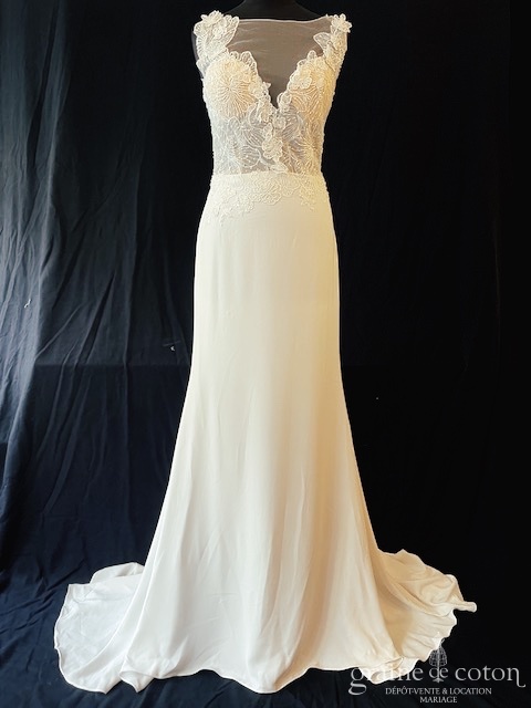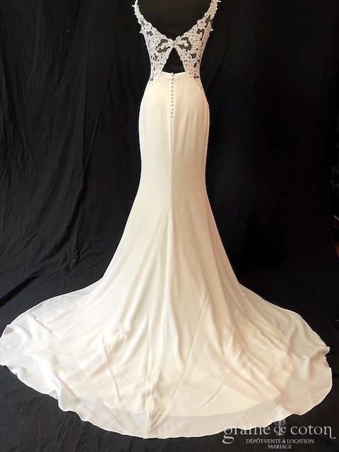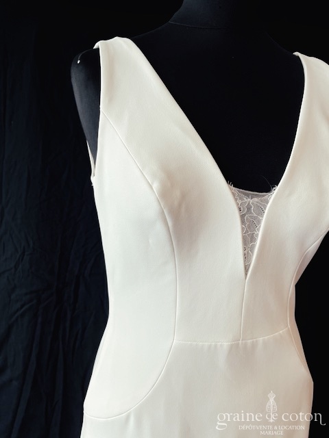 Dépôt du modèle « Geranium » de White One pour Pronovias, fourreau en crêpe fluide et empiècements de dentelle : glamour et élégante. Taille 36, référence 6117.