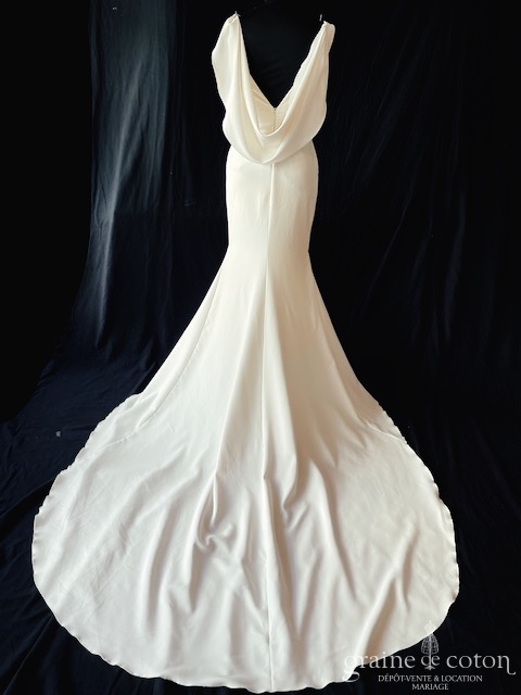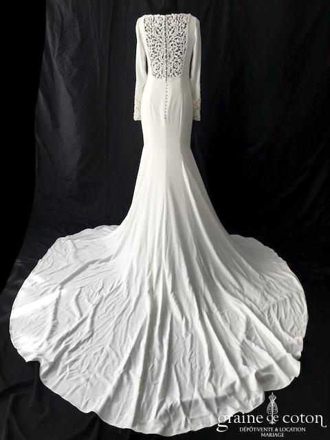 Dépôt du somptueux modèle « Galaxy » de l’Atelier Pronovias, en crêpe de soie ivoire clair et dos rebrodé de perles. Lumineuse, seyante et glamour, une coupe fourreau décolleté V mémorable ;o) …