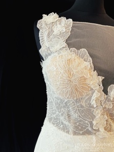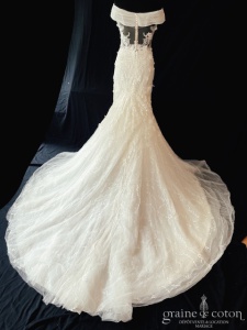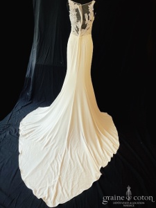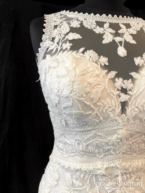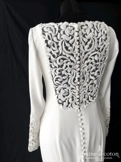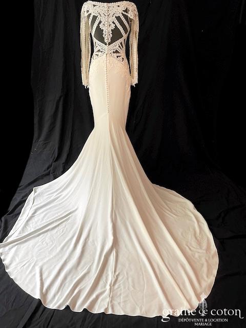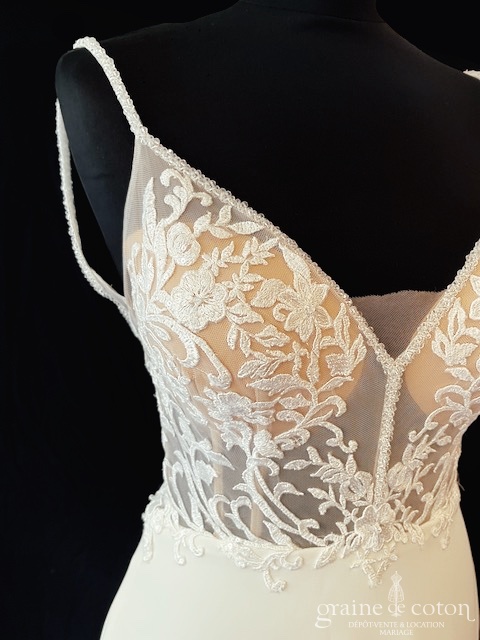 Entrée de la robe « Emily » de Pronovias, sirène en crêpe et guipure délicatement perlée, décolletés V devant et dos, somptueuse et lumineuse ;o) Taille 38, référence 5824.