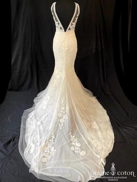 Dépôt du modèle « Alga » de San Patrick, fourreau en tulle fluide et dentelle brodée, décolleté V et dos transparent. Somptueuse et glamour ! Taille 42, référence 5773.