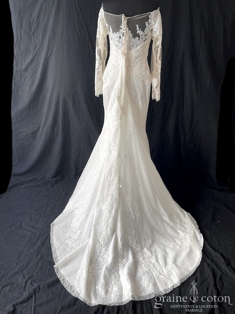 Dépôt du modèle « Perla » d’Elegance Sposa, coupe sirène tout en dentelle avec col et manches longues : classe et élégante. Taille 36, référence 5853.