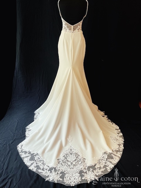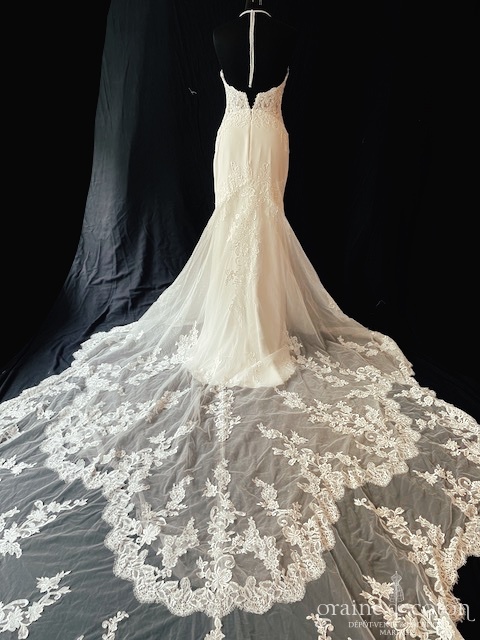 Dépôt du modèle sirène « Laëtitia » de San Patrick pour Pronovias, en crêpe fluide et dentelle échancrée, sublime et lumineuse ! Taille 38, référence 5840. Voile long en tulle fin et …