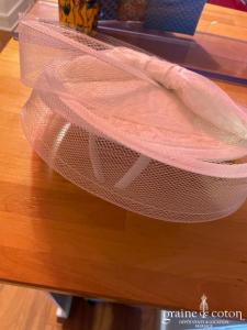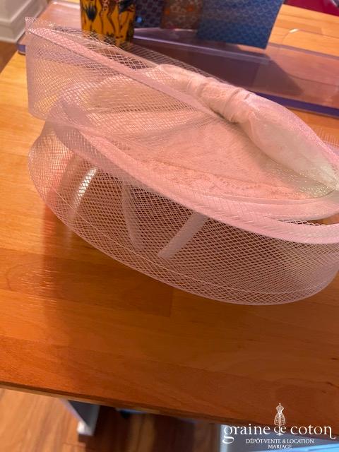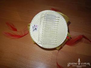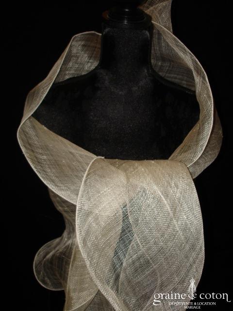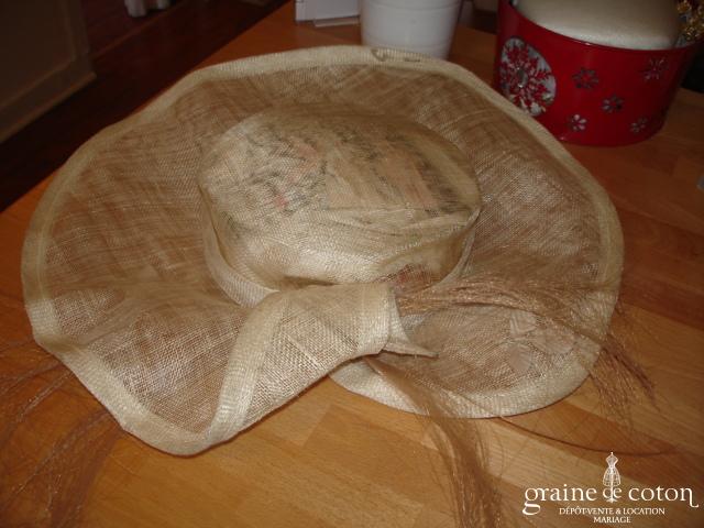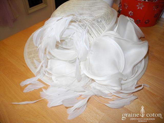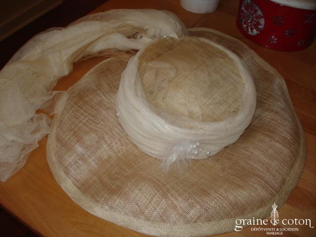 Chapeau en sisal ivoire avec noeud en tulle de soie, piqué de perles nacré et de plumes.