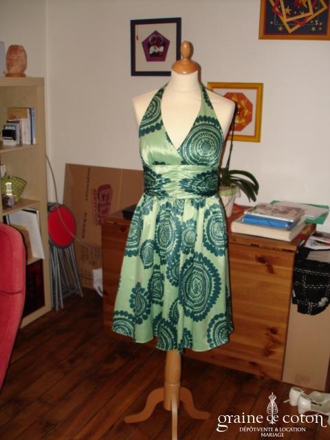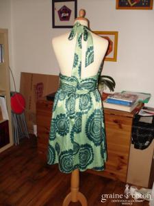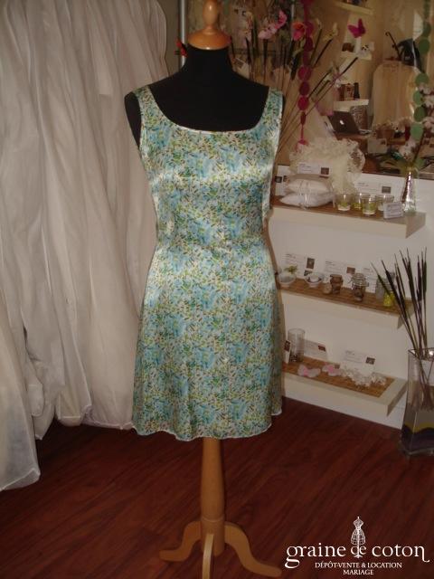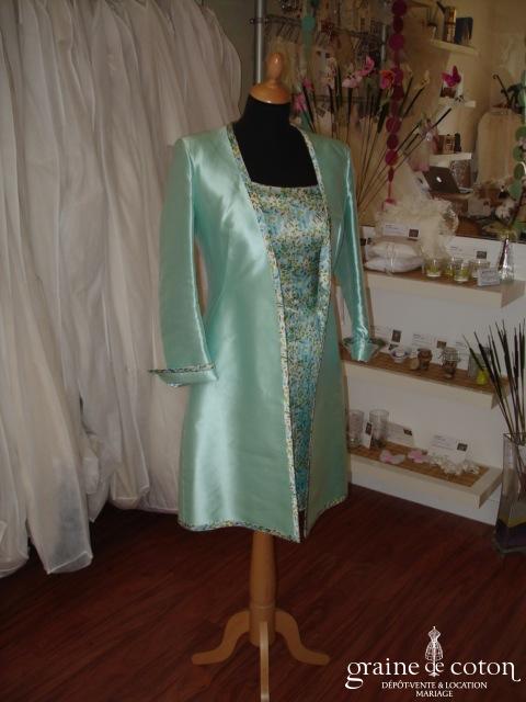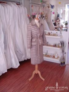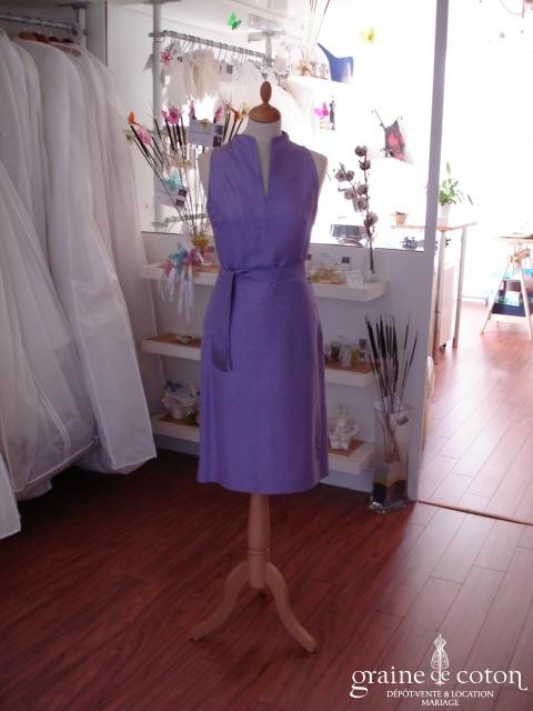 Robe en satin lie de vin, décolleté carré, près du corps jusqu’aux hanches, la jupe s’évasant ensuite. La jupe est longue jusque sous les genoux devant et touche quasiment par …