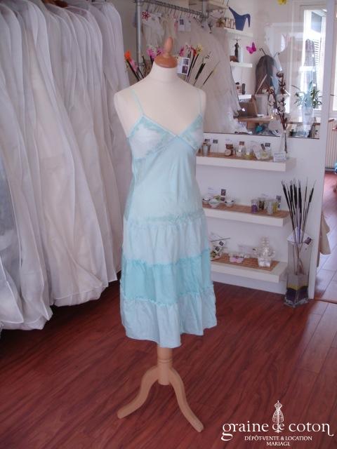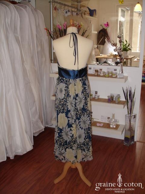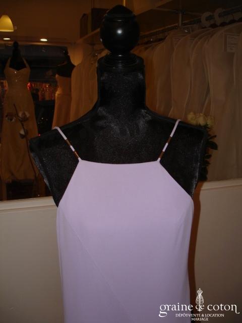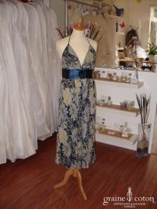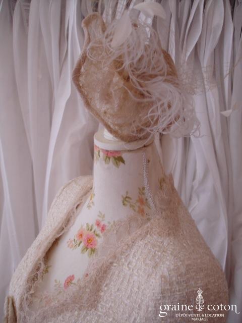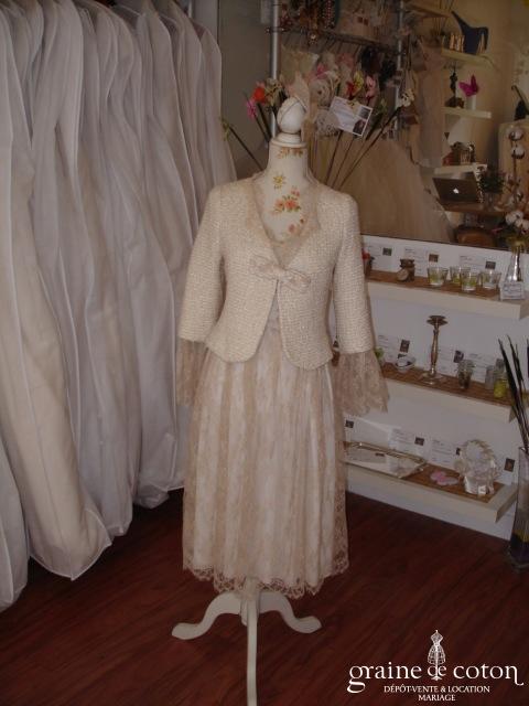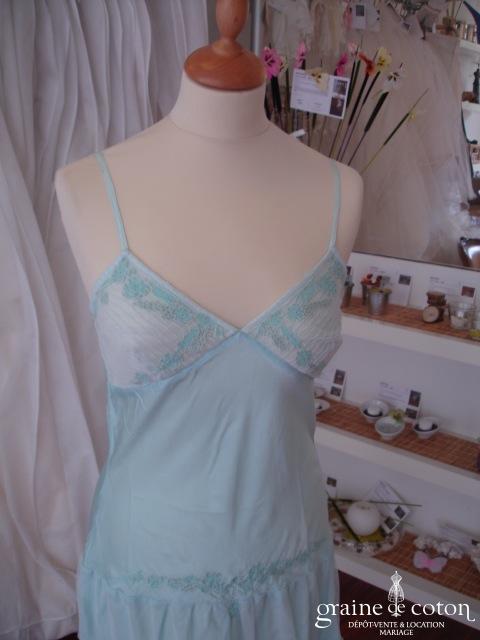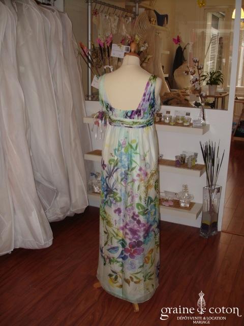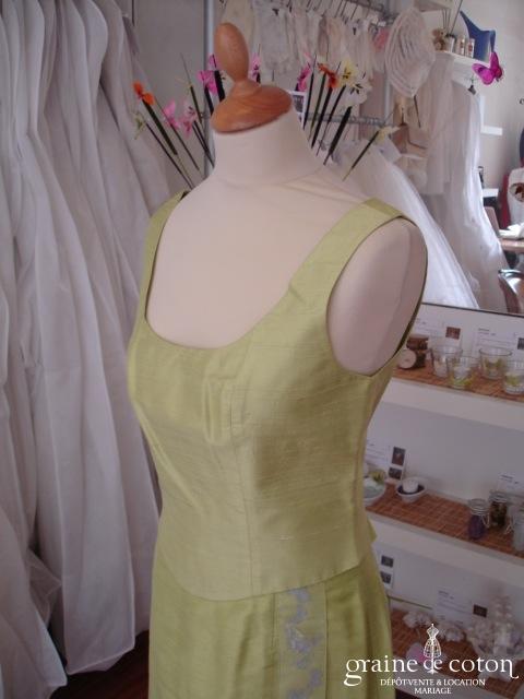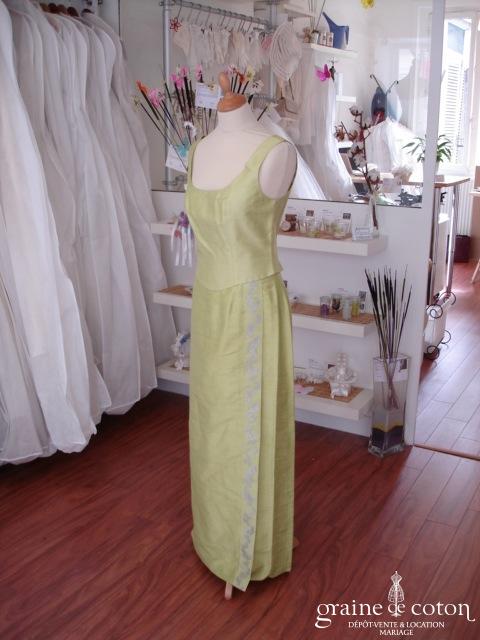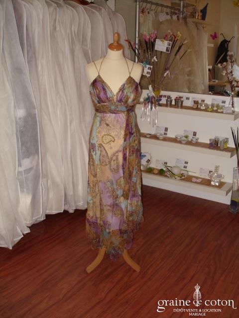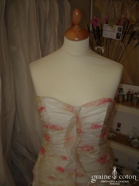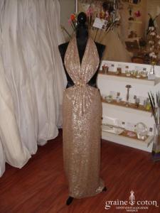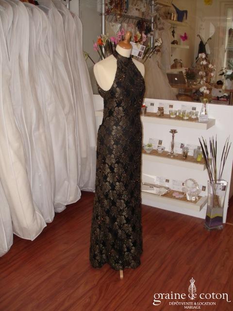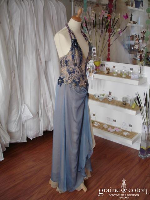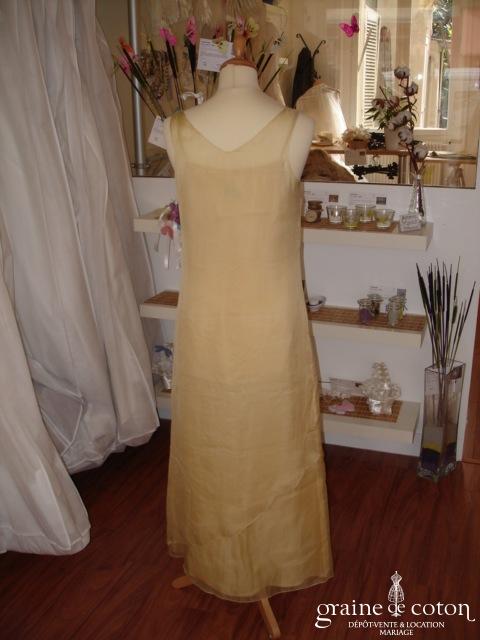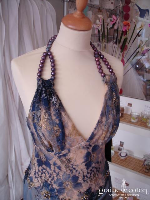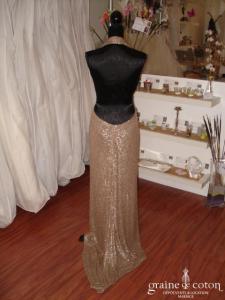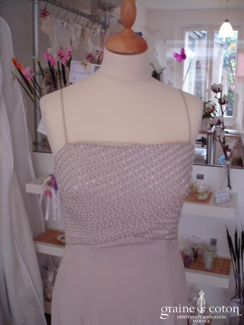 Robe longue crème : bustier entièrement brodé de perles aux reflets or et ivoire. Petites bretelles. Jupe fendue dans le dos.