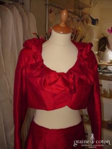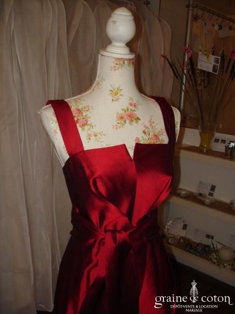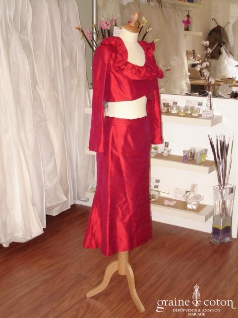 Robe deux pièces rouge foncé/brodeaux pouvant servir de robe de soirée ou de robe de mariée. Bustier irisé, avec un voile amovible. Jupe drapé de tulle et d’organza, tenus par …