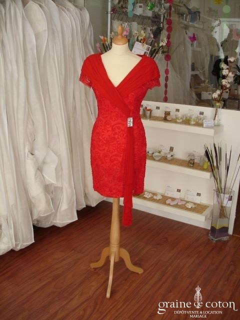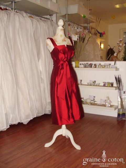 Robe une pièce taille empire rouge : le bustier est pailleté et souligné par un noeud rouge. Jupe mi longue (sous le genou) fendue, fluide, rouge.