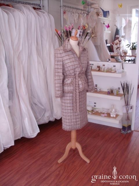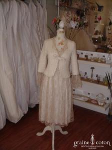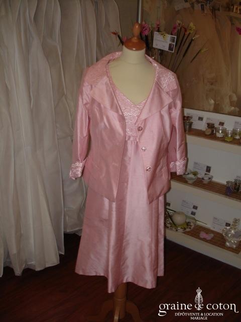 Robe longue une pièce à manches longues : tulle doublé, couleur vieux rose avec applications de broderies et dentelles.