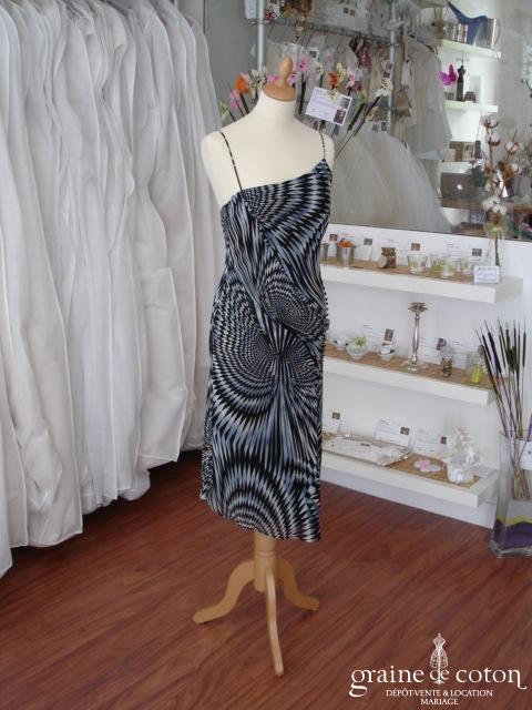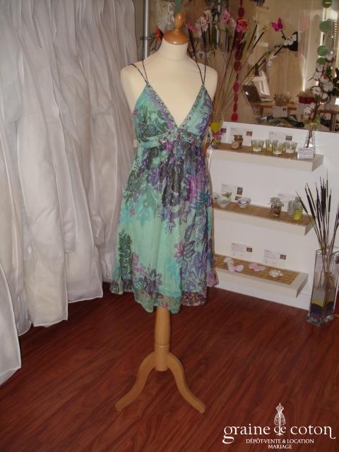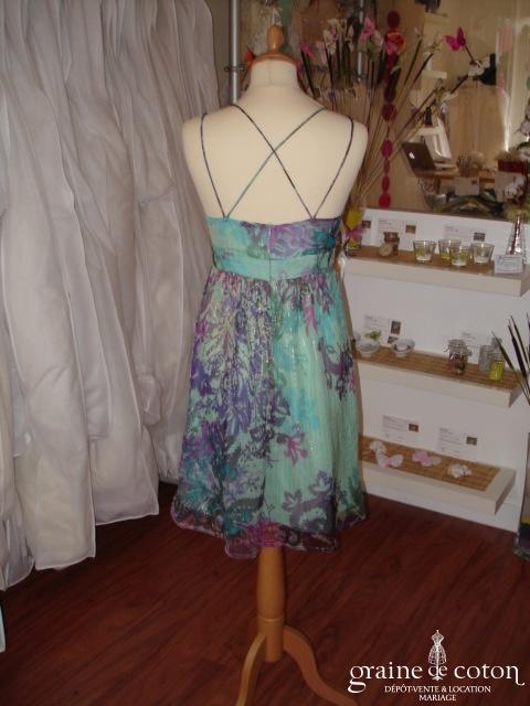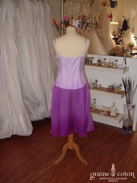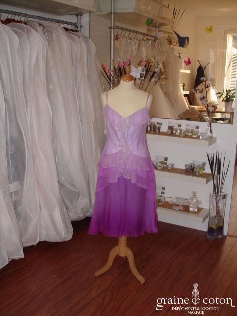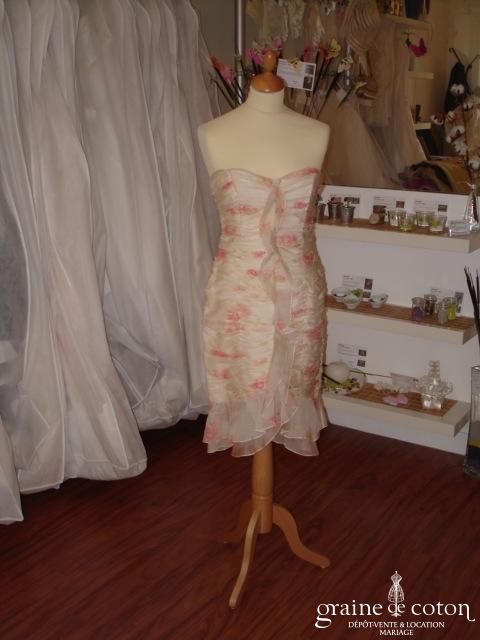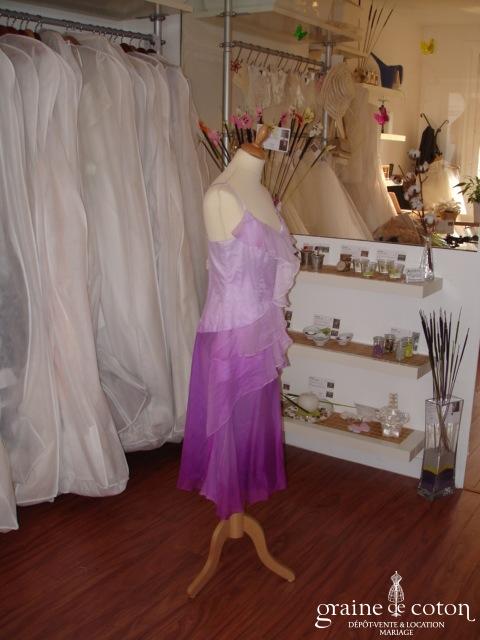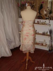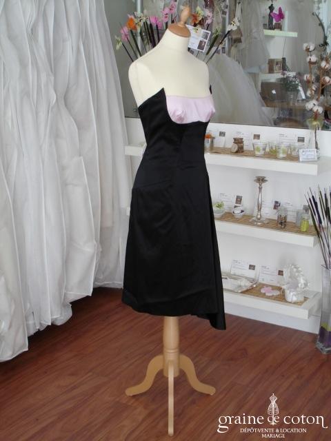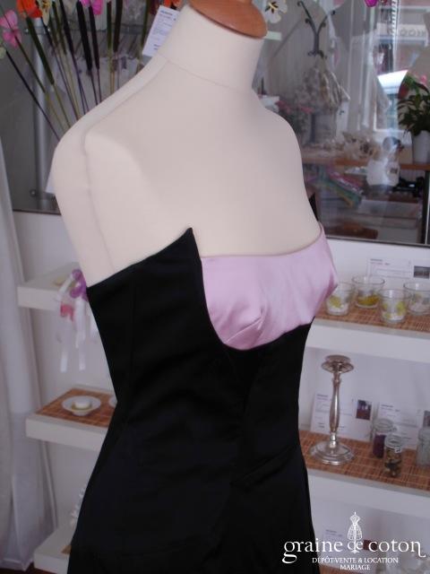 Robe aux genoux, rose foncé satiné avec appliques de fleurs noires en dentelle. La jupe est formée de 2 épaisseurs, l’une plus courte que l’autre. Dos lacé pour un ajustement …