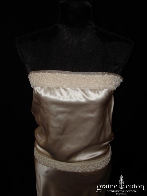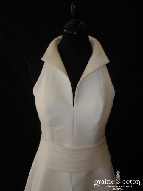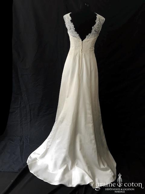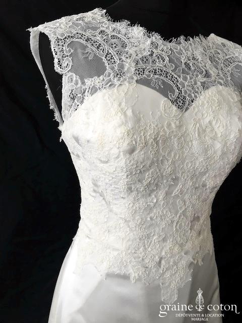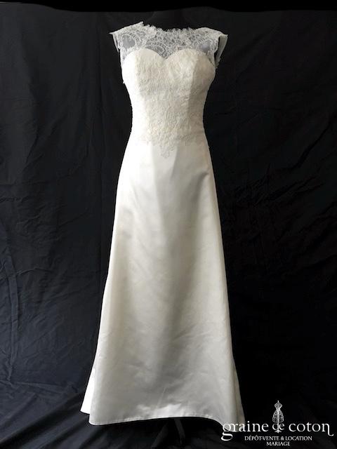 Robe une pièce ivoire : bustier tout en dentelle, décolleté coeur recouvert, larges bretelles et petit col, dos échancré en V. Jupe fluide fourreau en satin ivoire, petite traîne. Classe …