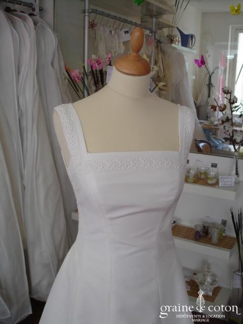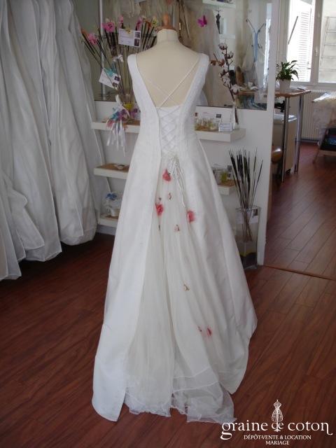 Robe une pièce blanche : décolleté carré bordé d’un galon rappelant la Rome antique. Épurée devant, elle se lace dans le dos et s’ouvre sur du tulle décoré de roses …