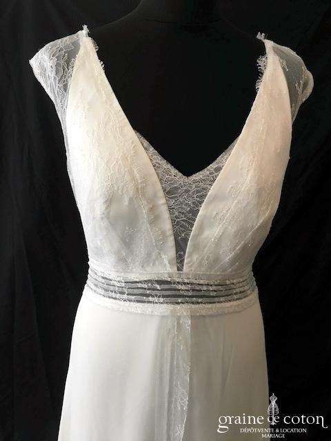 Robe une pièce ivoire clair : bustier taille haute avec bretelles, dos nu encadré de dentelle, bas du dos boutonné. Jupe fluide en mousseline ourlée de la dentelle du top. …