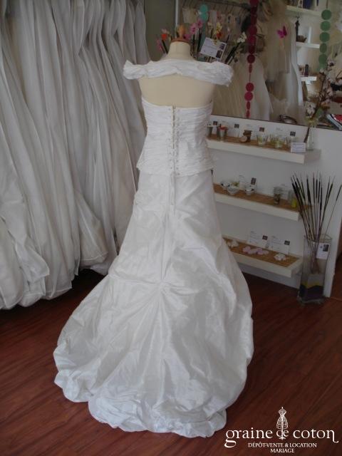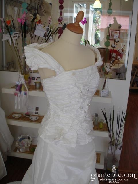 Robe une pièce ivoire clair : top en guipure avec manches, dos nu. Jupe taille haute recouverte d’un tulle plissé, petite traîne pouvant se relever. Fluide, légère et bohème.