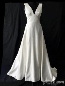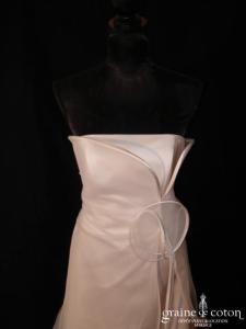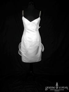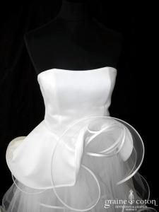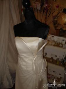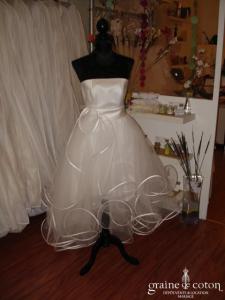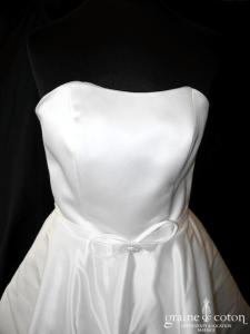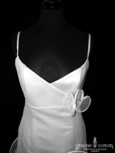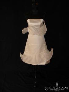 Robe une pièce en satin « peau d’ange » blanc cassé. Bustier avec tour de cou (peut être retiré), volutes de tulle partant de la taille en forme de fleur, et tombant …