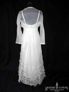 Robe une pièce en tulle, dentelle et fleurs en relief ivoire clair : top décolleté en V avec bretelles et dos nu. Jupe taille haute largement évasée avec traîne, tombé …