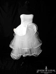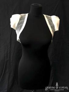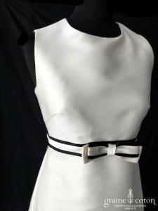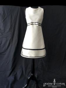 Robe une pièce courte en mikado et tulle ivoire clair : top coupe empire souligné d’une ceinture avec noeud noir et ivoire. Col rond, larges bretelles, dos fermé. Jupe au …