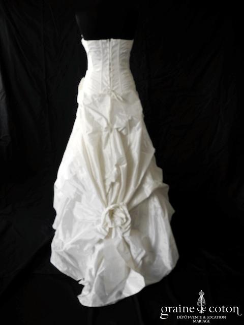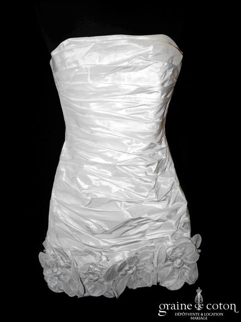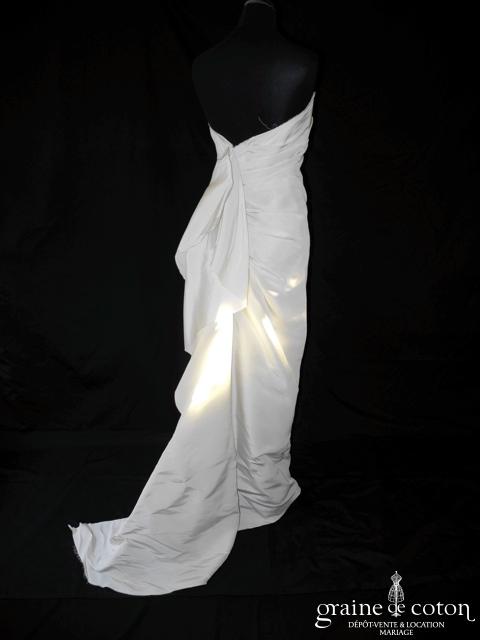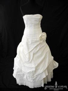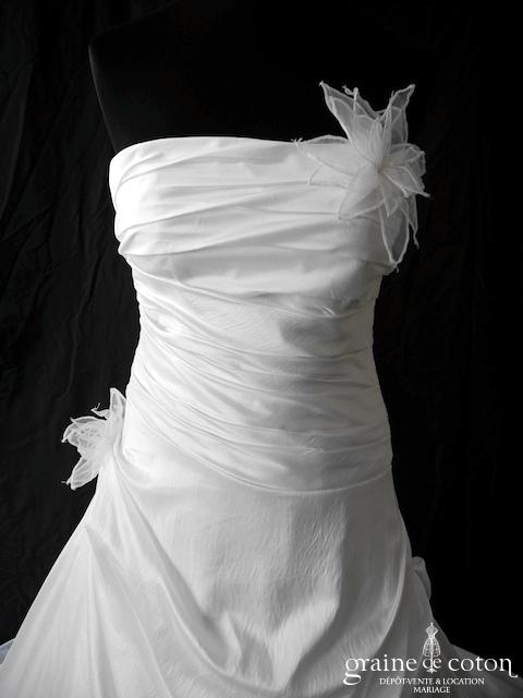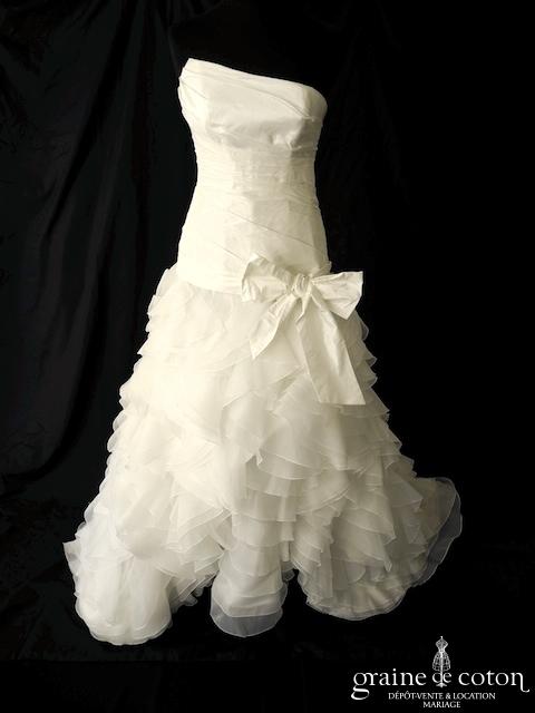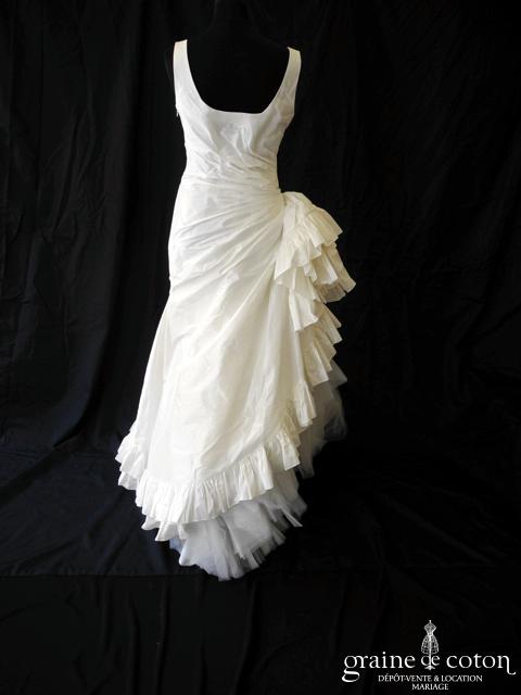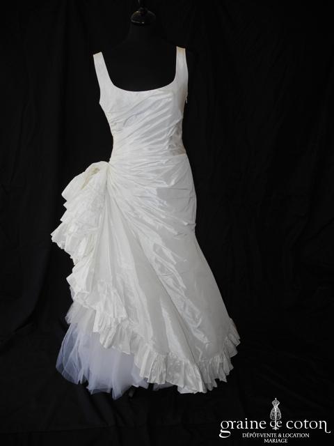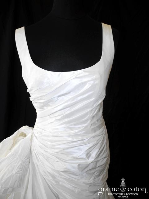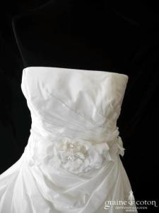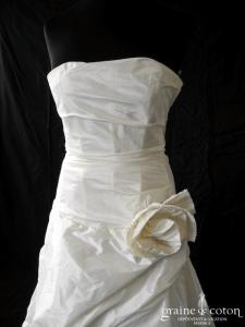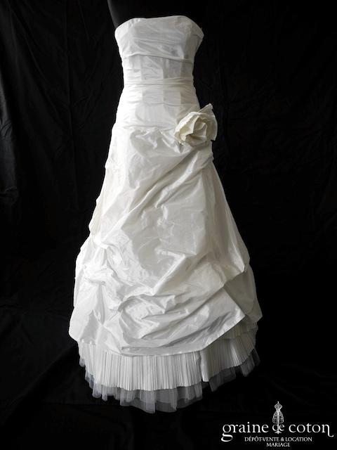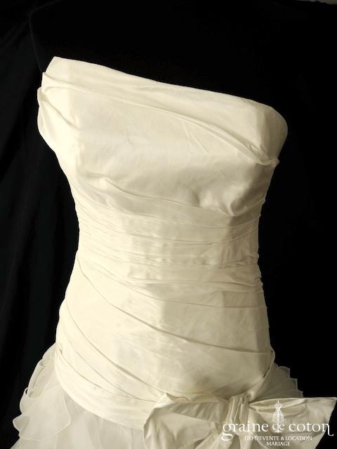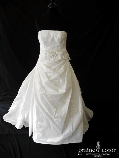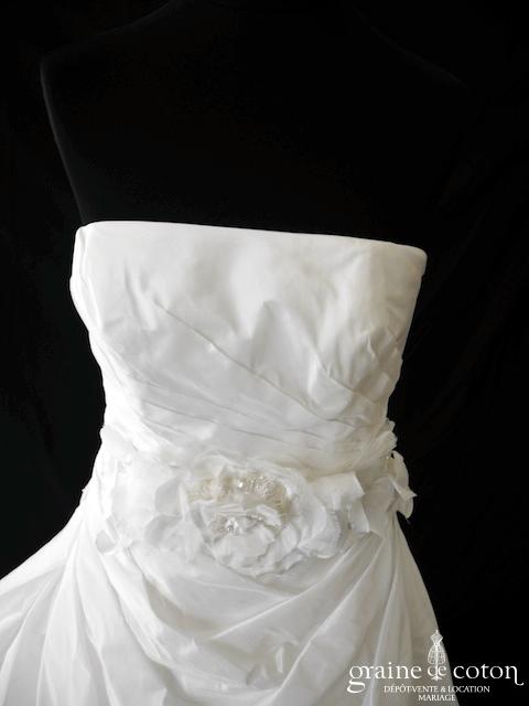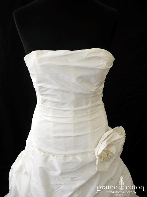 Robe une pièce drapée en taffetas plissé ivoire : bustier forme coeur, drapé à la taille. Jupe fourreau s’évasant sur un large volant de taffetas plissé, orné de grosses fleurs …