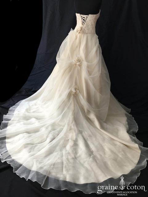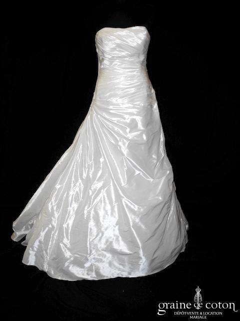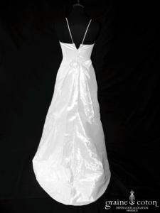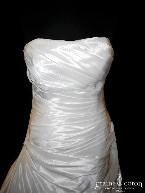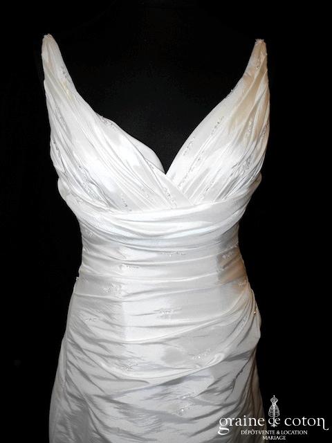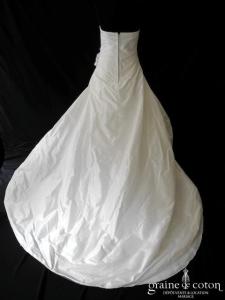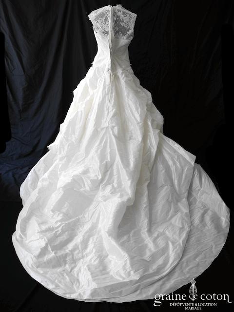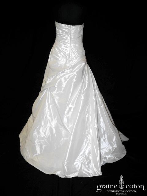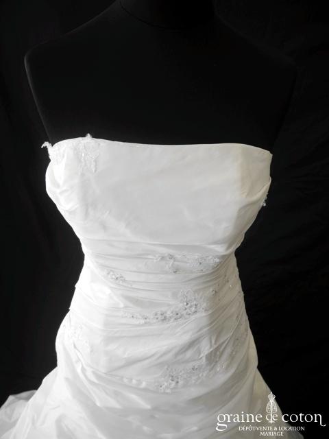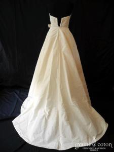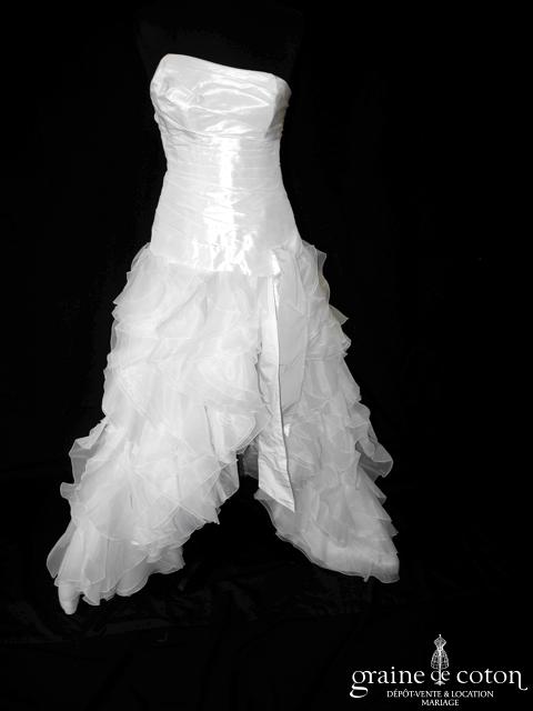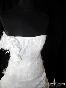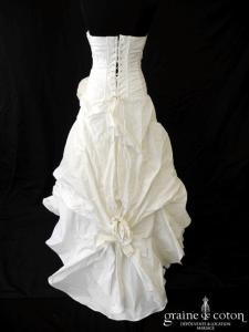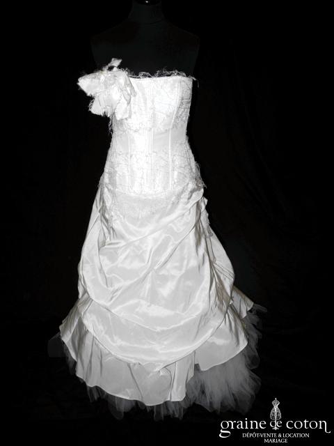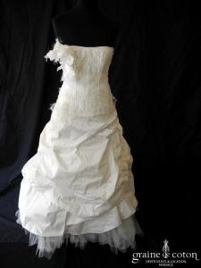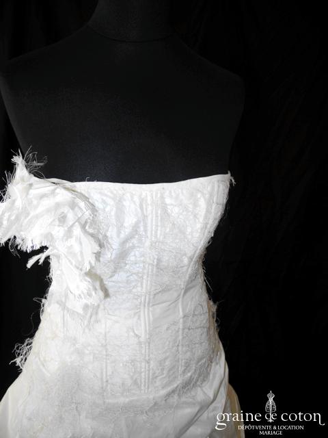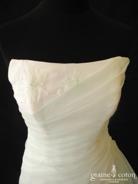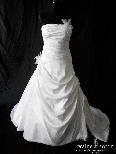 Robe une pièce drapée en taffetas plissé ivoire : bustier forme coeur, drapé à la taille. Jupe fourreau s’évasant sur un large volant de taffetas plissé, orné de grosses fleurs …